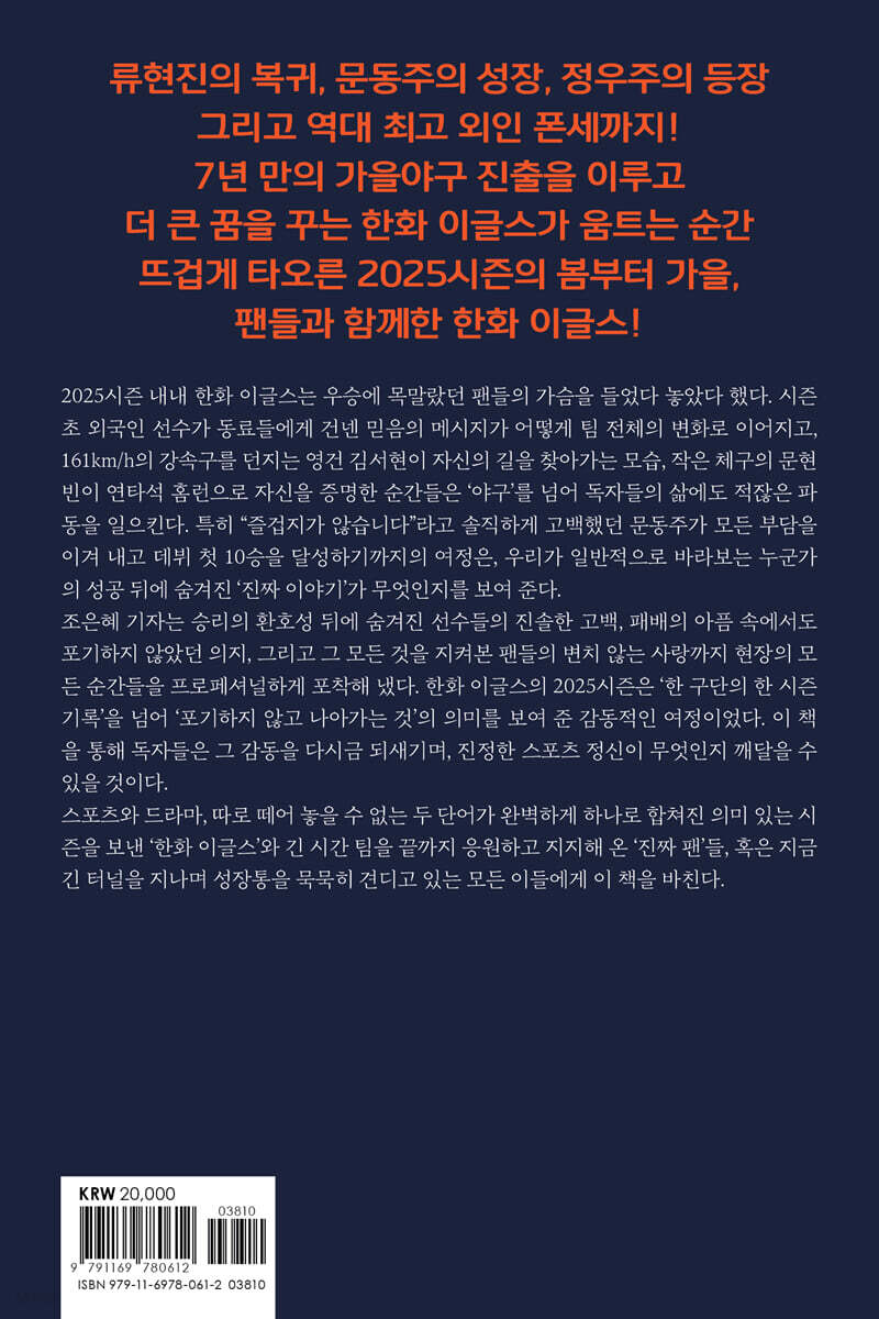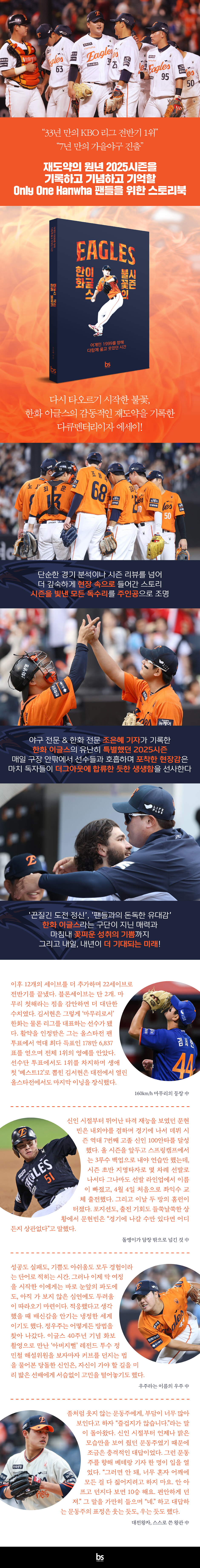 7년 만의 가을야구 진출을 이루고 더 큰 꿈을 꾸는 한화 이글스가 움트는 순간 뜨겁게 타오른 2025시즌의 봄부터 가을, 팬들과 함께한 한화 이글스! 한국프로야구 역사상 가장 드라마틱한 시즌 중 하나로 기록될 한화 이글스의 2025시즌. 33년 만의 전반기 1위라는 기적 같은 성과, 7년 만의 가을야구 진출이라는 쾌거 뒤에는 수많은 감동적인 이야기들이 숨어 있다. 이 책은 그 모든 이야기를 한 권에 담아 낸 진정한 의미의 ‘팬북’이다. 2024년 류현진의 복귀 소식으로 시작된 기대감의 불꽃은 생각보다 금방 사그라졌지만, 이는 모두 뒤이어 맞이할 2025시즌의 가시적 성과가 터져 나오기 직전의 진통이었다. 2025시즌 내내 한화 이글스는 25년 넘게 우승에 목말랐던 팬들의 가슴을 들었다 놓았다 했다. 시즌 초 5연패의 위기 속에서 폰세가 더그아웃 앞에 선수단을 불러 모으며 “한 점만 뽑으면 우리가 잘 풀릴 수 있으니 힘내자”고 외쳤던 3월 29일의 그 순간부터, 외국인 선수가 동료들에게 건넨 믿음의 메시지가 어떻게 팀 전체의 변화로 이어지고, 161km/h의 강속구를 던지는 영건 김서현이 “마무리가 천직인 것 같다”라며 자신의 길을 찾아가는 모습, 작은 체구의 문현빈이 “돌멩이도 담장을 넘을 수 있다”라는 것을 연타석 홈런으로 증명한 순간들은 ‘야구’를 넘어 독자들의 삶에도 파동을 일으킨다. 특히 “즐겁지가 않습니다”라고 솔직하게 고백했던 문동주가 모든 부담을 이겨 내고 데뷔 첫 10승을 달성하기까지의 여정은, 우리가 일반적으로 바라보는 누군가의 성공 뒤에 숨겨진 ‘진짜 이야기’가 무엇인지를 보여 준다. 그가 느꼈을 무거운 부담감과 많은 구설수, 부상과 부진을 극복해 내는 그 모든 과정에서 느꼈을 두려움과 의지가 이 책에는 고스란히 담겨 있다. 그리고 황준서와 조동욱, 정우주 등 한화 이글스의 어린 선수들이 만들어 낸 많은 기적 같은 순간들까지. 이 모든 이야기는 25년 넘는 시간을 기다린 팬들의 마음과 완벽하게 맞닿아 있다 조은혜 기자는 현장의 이 모든 순간들을 프로페셔널하게 포착해 냈다. 승리의 환호성 뒤에 숨겨진 선수들의 진솔한 고백, 패배의 아픔 속에서도 포기하지 않았던 의지, 그리고 그 모든 것을 지켜본 팬들의 변치 않는 사랑까지. 한화 이글스의 2025시즌은 ‘한 구단의 한 시즌 기록’을 넘어 ‘포기하지 않고 나아가는 것’의 의미를 보여 준 감동적인 여정이었다. 이 책을 통해 독자들은 그 감동을 다시금 되새기며, 진정한 스포츠 정신이 무엇인지 깨달을 수 있을 것이다. 스포츠와 드라마, 따로 떼어 놓을 수 없는 두 단어가 완벽하게 하나로 합쳐진 의미 있는 시즌을 보낸 ‘한화 이글스’와 긴 시간 팀을 끝까지 응원하고 지지해 온 ‘진짜 팬’들, 혹은 지금 긴 터널을 지나며 성장통을 묵묵히 견디고 있는 모든 이들에게 이 책을 바친다. |