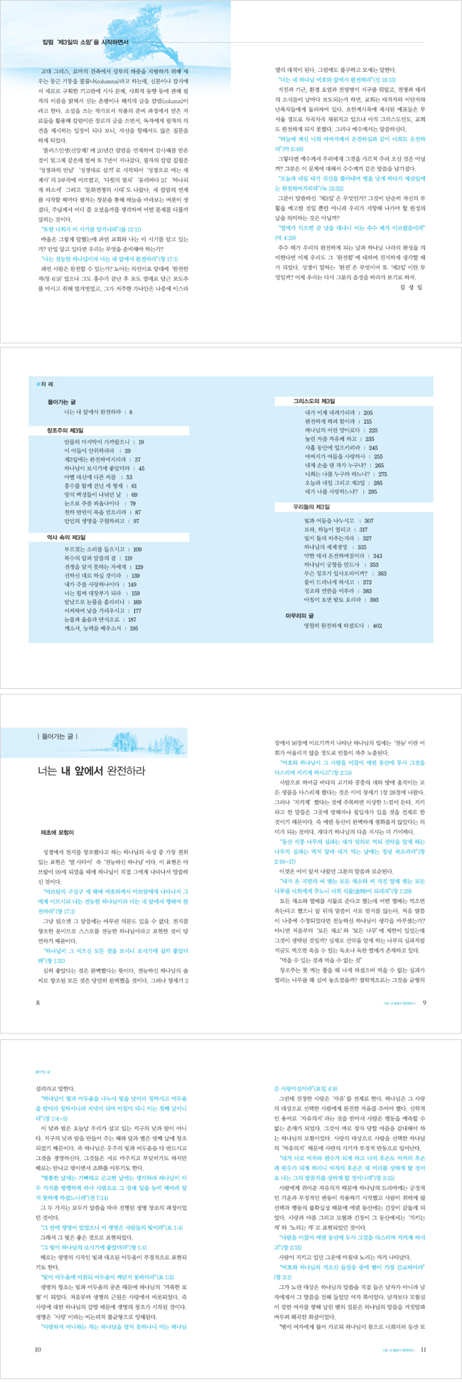 너는 내 앞에서 완전하라 창조주의 제3일?? 만물의 마지막이 가까왔으니 이 아들이 안위하리라??? 제3일에는 완전하여지리라? 하나님이 보시기에 좋았더라 아벨 대신에 다른 씨를?? 홍수를 함께 건넌 세 형제? 땅의 백성들이 나뉘던 날? 눈으로 주를 뵈옵나이다?? 천하 만민이 복을 얻으리라 만민의 생명을 구원하려고? 그리스도의 제3일 내가 이제 내려가리라 완전하게 하려 함이라 하나님의 어린 양이로다? 눌린 자를 자유케 하고 사흘 동안에 일으키리라 아버지가 아들을 사랑하사?? 내게 손을 댄 자가 누구냐? 너희는 나를 누구라 하느냐? 오늘과 내일 그리고 제3일 네가 나를 사랑하느냐? 역사 속의 제3일? 부르짖는 소리를 들으시고? 복수의 칼과 말씀의 검?? 전쟁을 알지 못하는 자에게 선하신대로 하실 것이라?? 내가 주를 사랑하나이다?? 너는 힘써 대장부가 되라? 밤낮으로 눈물을 흘리리니? 어찌하여 낯을 가리우시고? 눈물과 울음과 탄식으로?? 깨소서, 능력을 베푸소서? 우리들의 제3일 빛과 어둠을 나누시고 보라, 하늘이 열리고 빛이 둘러 비추는지라 하나님의 세계경영 약한 데서 온전하여짐이라 하나님이 궁창을 만드사 무슨 징조가 있사오리이까? 뭍이 드러나게 하시고 징조와 연한을 이루라 아침이 오면 밤도 오리라? 마무리의 글 영원히 완전하게 하셨도다 |