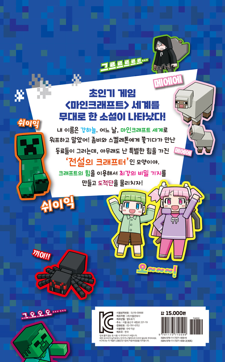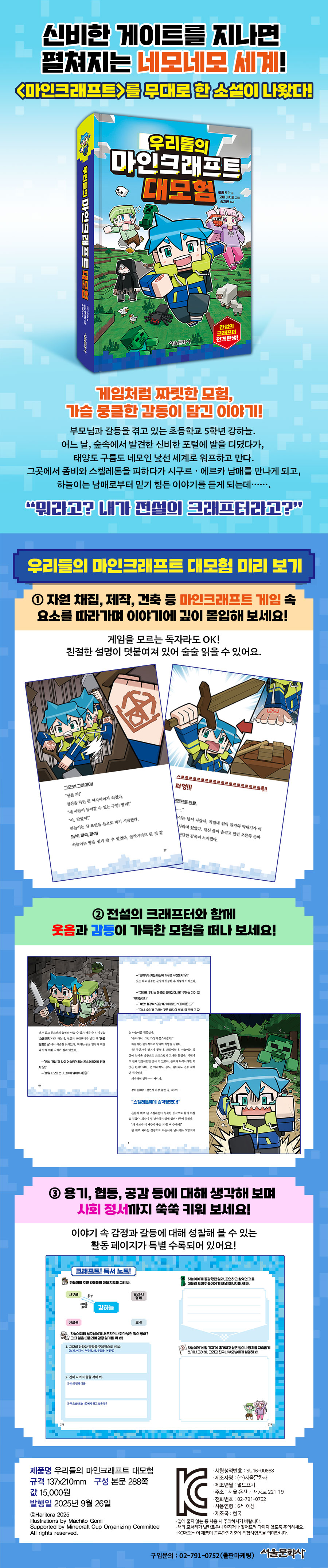 흥미로운 모험에 합류하고, 용기 · 협동 등 소중한 가치를 배워 보자! ■ 마인크래프트 세계와 설정을 모티프로 한 전개 태양도 구름도 네모인 세계, 크래프트의 규칙, 자원 채집과 건축……. 마인크래프트를 조금이라도 아는 독자라면 더욱 깊이 몰입할 수 있는 게임 속 요소들이 이야기에 가득하다. 게임을 혹 모르는 독자라도 친절한 설명이 덧붙여져 있어 전혀 무리 없이 이야기에 몰입할 수 있다. ■ 웃음과 울림을 동시에 주는 모험 활극 비밀스러운 숲속 포털, 좀비와 스켈레톤의 추격, 미스터리한 인물의 등장, 약탈자와의 공방전 등 흥미진진한 소재와 장면들이 코믹한 대사와 어우러져 한순간도 눈을 뗄 수 없게 한다. 모험의 끝에서는 가슴 뭉클한 감동과 긴 여운이 남는다. ■ 용기 · 협동 · 공감 등 소중한 가치가 담긴 이야기 사춘기에 접어든 주인공 강하늘은 부모님과 갈등을 겪다가 낯선 세계로 도피하듯 워프한다. 그곳에서 만난 시구르·에르카와 함께 팀을 이루어 다양한 모험을 겪게 되고, 그 과정에서 위험 앞에서 물러서지 않는 용기, 서로를 신뢰하고 역할을 나누는 협동, 타인을 이해하고 받아들이는 공감을 배우며 한층 성장하게 된다. 권말에는 이야기 속 감정과 갈등에 대해 한번 더 성찰해 볼 수 있는 독서 노트가 특별 수록되어 사회 정서를 더욱 키울 수 있다. |