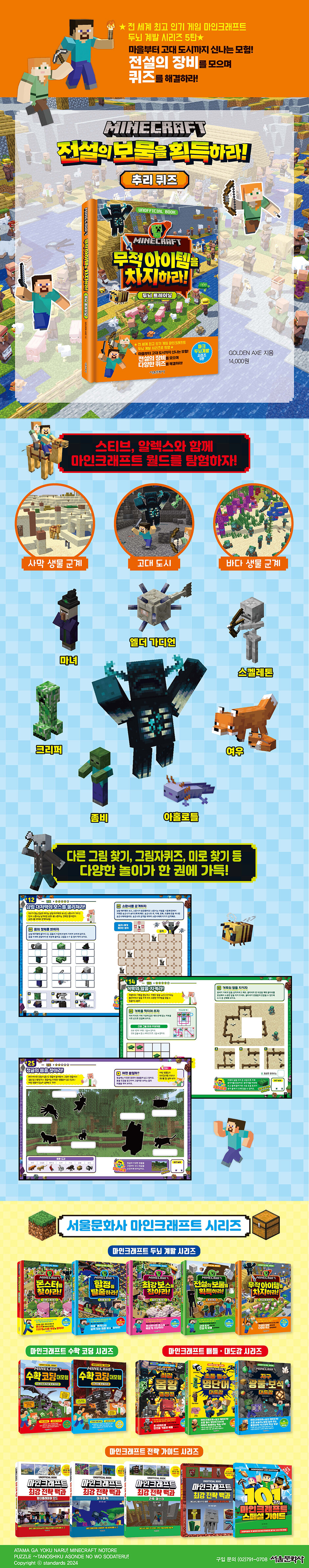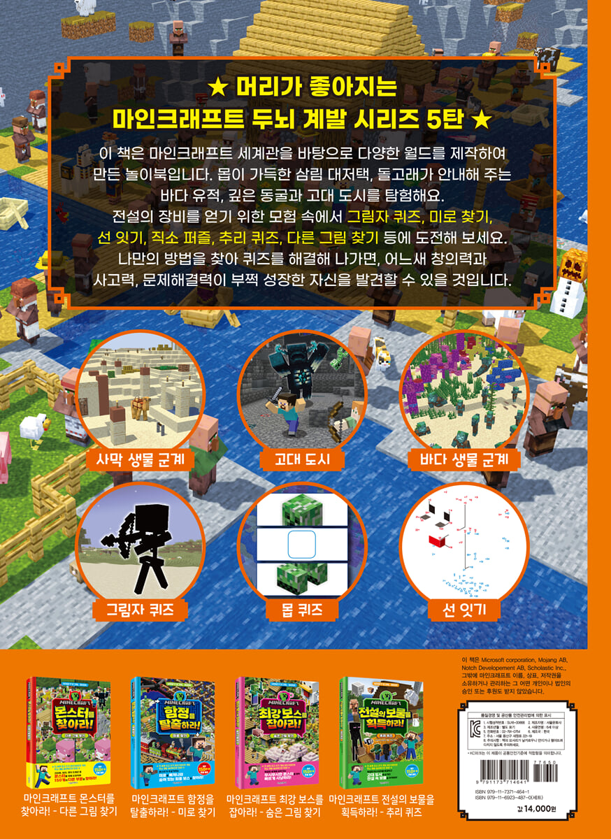 02 숲에 숨어 있는 몹을 찾아라! 03 위험한 몹을 피해 도망쳐라! 04 첫 번째 마을에 방문하라! 05 모험에 필요한 음식을 얻어라! 06 지도 제작자와 지도를 거래하라! 07 악당자에게서 마을을 지켜라! 08 늪의 슬라임을 피하라! 09 사막 마을에서 낙타를 구하라! 10 사막의 피라미드를 공략하라! 11 삼림 대저택을 탐색하라! 12 삼림 대저택의 보스를 물리쳐라! 13 낚시로 물고기를 잡아라! 14 거북의 알을 지켜라! 15 바다 탐험을 위한 보트를 만들어라! 16 수중 호흡의 물약을 만들어라! 17 돌고래를 쫓아 폐허를 찾아라! 18 강력한 삼지창을 획득하라! 19 난파선에서 보물 지도를 얻어라! 20 화려한 산호초를 찾아라! 21 바다 생물을 사냥하라! 22 전달체를 만들어라! 23 바다 유적을 탐험하라! 24 엘더 가디언을 물리쳐라! 25 정글의 몹을 찾아라! 26 지하 동굴을 찾아라! 27 동굴 탐험을 준비하라! 28 어두운 동굴을 탐색하라! 29 동굴의 깊은 곳까지 돌파하라! 30 동굴의 몹을 찾아라! 31 동굴의 몹을 물리쳐라! 32 지하에서 호수를 탐색하라! 33 희귀한 광석을 발견하라! 34 폐광에서 보물을 찾아라! 35 고대 도시를 탐험하라! 36 워든으로부터 도망쳐라! 풀이와 답 |