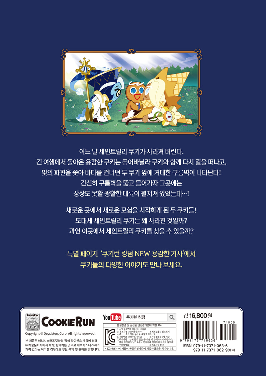 사라진 세인트릴리 쿠키를 찾아 떠나는 용감한 쿠키 일행의 비스트이스트 대륙 탐험기! 이번 권에서는 용감한 쿠키와 퓨어바닐라 쿠키가 친구를 구하기 위해 미지의 대륙으로 떠나 카라멜레온 쿠키, 역사학자 쉐도우밀크 쿠키와 함께 늪지 탈출·구름벽 돌파·요정왕국의 불꽃 시험 등 위험천만한 모험을 펼친다. 친구를 믿을 것인가, 의심할 것인가? 쿠키들 사이에서 오해하고, 다투고, 화해하는 과정을 통해 우정은 한층 더 단단해지고, 독자들도 자연스럽게 우정·용기·협력의 가치를 배우게 된다. 특별 수록! ‘NEW 용감한 기사’ 코너 작품 속 상황을 바탕으로 ‘친구와 다툰 뒤 화해하고 싶을 때 어떻게 말하면 좋을지’, ‘상대의 기분을 상하게 하지 않고 내 마음을 전할지’ 같은 질문을 던지며 독자가 직접 생각해 보고 답을 적어 볼 수 있게 구성했다. 단순히 만화책을 즐기는 것이 아니라 관계·소통·배려를 배울 수 있게 구성하였다. |