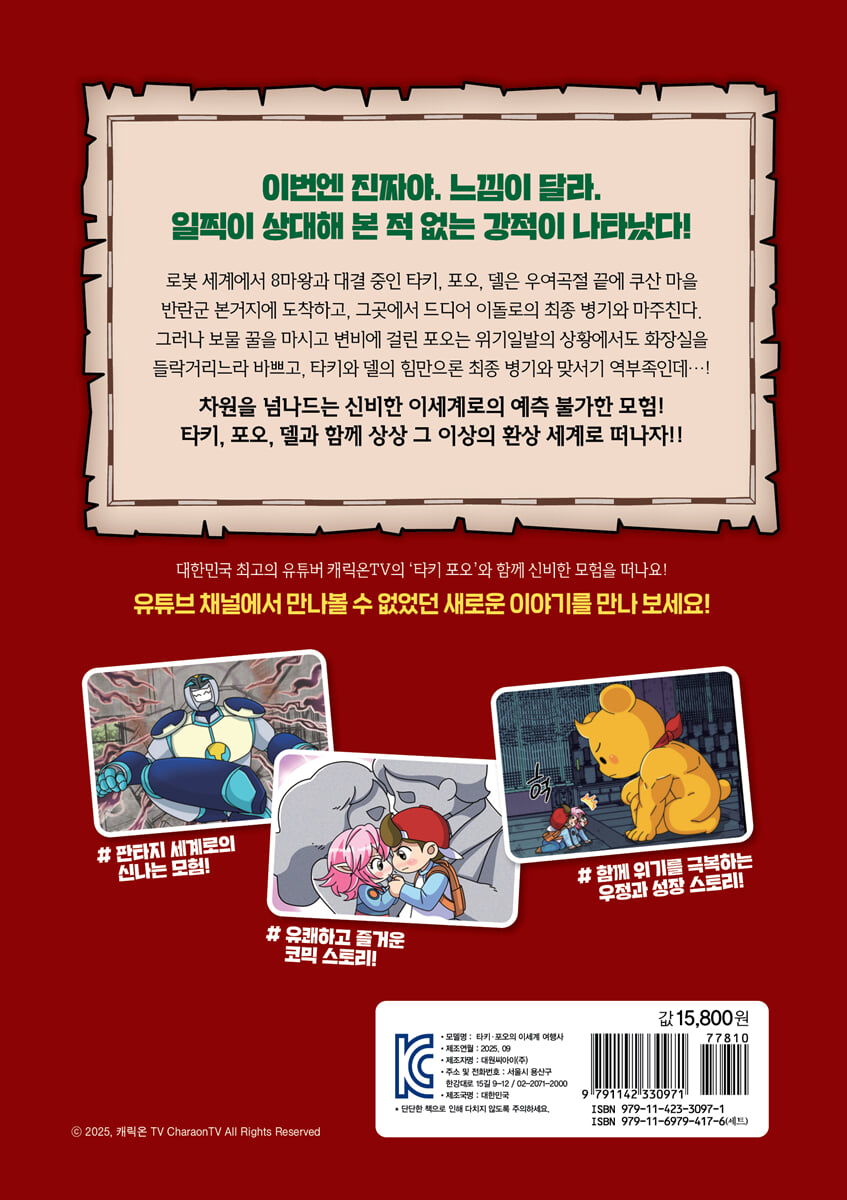 248만 구독자, 대한민국 최고의 유튜버 캐릭온TV의 ’타키와 포오‘가 이세계 여행사를 차리고 여러분을 기다립니다! 유튜브 채널에서 만나볼 수 없었던 새로운 이야기를 책으로 만나 보세요! 검증된 베스트셀러 작가를 통해 재탄생한 타키와 포오의 기상천외한 모험 이야기! 책을 읽는 사이 나도 몰랐던 탐험심, 도전 정신 UP! 서로를 돕고 이끄는 진~한 우정에 감동! 보너스로 상상력과 창의력도 업그레이드 됩니다. 독자가 인정하고 판매로 증명된 책을 직접 만나보세요! |