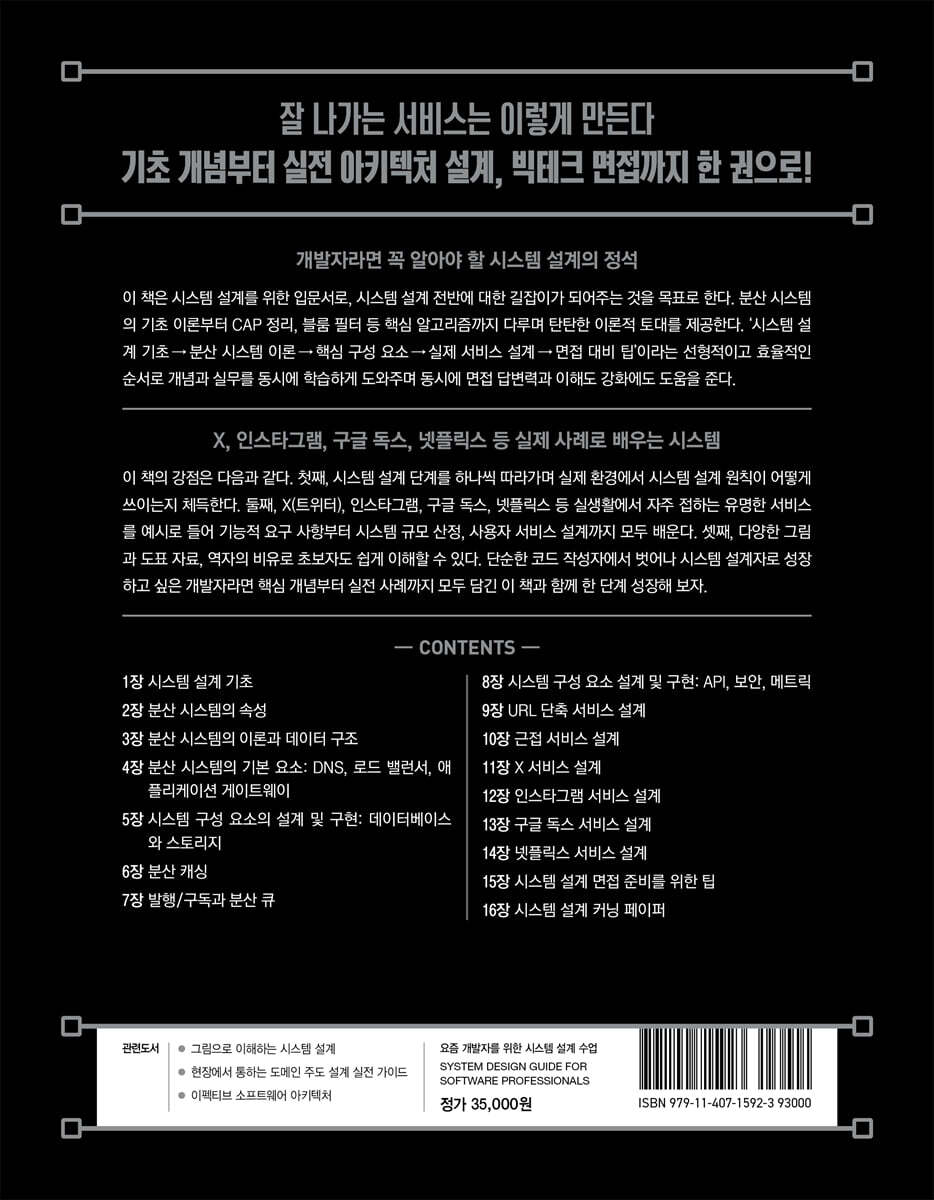 무엇보다도 이 책이 특별한 이유는 개념 설명에만 머무르지 않고 실제 서비스 설계 과정을 단계별로 다루고 있다는 점입니다. 기능적·비기능적 요구 사항 정의, 트래픽 추정과 시스템 규모 산정, API 설계, 다이어그램 작성 등 실무에서 반드시 고려해야 할 요소를 종합적으로 보여 줍니다. 처음 시스템 설계 공부를 시작하는 개발자뿐만 아니라, 실무에서 더 깊이 있는 이해를 하고 싶은 개발자에게도 큰 도움이 될 만한 책입니다. 기초부터 실무 적용까지 넓고 깊게 다루고 있는 만큼, 시스템 설계에 관심이 있는 모든 개발자에게 강력히 추천합니다. - 임재곤 (CJ ENM 백엔드 개발자)