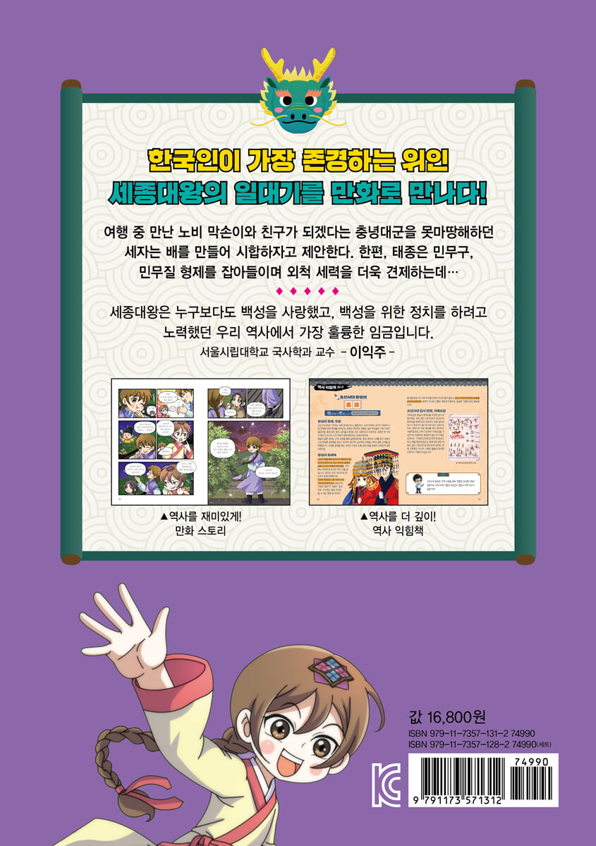 세종대왕의 일대기를 만화로 만나다! 역사를 생생하게! 우리 영웅 시리즈의 두 번째 인물, 《열혈 세종대왕》 한글을 창제한 조선 최고의 왕 세종대왕의 특별한 어린 시절 이야기! 이도 왕자가 어떻게 위대한 임금으로 성장해 갔는지, 스물두 살에 임금이 되어서 32년 동안 어떤 업적을 남겼는지, 그런 업적을 남기기 위해 얼마나 노력했는지를 알 수 있을 거예요. 이 책을 읽고 세종대왕에 대해서 잘 알게 될 뿐 아니라 세종대왕을 가진 우리 역사가 자랑스럽다는 생각도 함께하기를 바랍니다. -서울시립대학교 국사학과 교수 이익주- 세종대왕기념관은 1973년 10월9일 한글날에 개관하여 52여년 동안 세종대왕의 위대한 업적과 정신을 널리 알리고 있습니다. 《열혈 세종대왕》은 아이들이 세종대왕을 단지 위대한 왕이 아닌, 고민하고 성장한 한 사람으로 이해할 수 있게 도와줍니다.?이 책을 위대한 성군의 정신을 자연스럽게 배우고 공감하고 싶은 어린이들에게 권하고 싶습니다. -세종대왕기념관장 차재경 - ◆ 이 책의 특징 ◆ 역사에 상상을 더하다! [열혈 세종대왕]은 세종대왕의 어린 시절 이야기를 역사에 근거한 가상의 에피소드를 섞어 만화로 그렸어요. 역사를 어렵고 지루한 옛날이야기로만 여기는 어린이들의 호기심을 자극하며, 자연스럽게 다음 이야기와 역사적인 사실들에 대해 궁금하게 만들어요.또한 세종대왕 어린 시절을 따라 함께 기뻐하고 함께 걱정하다 보면 아이들은 세종대왕의 어린 시절에 공감하게 돼요. 위대한 왕의 어린 시절을 생생히 따라가다 보면, 우리나라의 위인에게서 많은 배울 점을 찾을 수 있어요! 역사에 지식을 더하다! 서울시립대학교 국사학과 교수이신 역사학자 이익주 교수님의 특급 감수를 받아 이야기와 학습 코너의 완성도를 더욱 높였어요. 역사 심화 학습 코너인 ‘역사 익힘책’에서는 세종대왕과 같은 시대를 살았던 인물들의 이야기와 세종대왕과 얽힌 역사 속 사건들을 더 깊고 흥미롭게 배울 수 있어요. ‘역사 속의 진실 혹은 거짓’은 만화에서 나오는 내용 상상을 더한 창작 부분과 실제 역사적 사실을 구별하여 역사를 더 바르게 익힐 수 있도록 하였어요. 마지막에는 ‘세종대왕 연표’를 담아, 세종대왕 일대기의 큰 흐름을 한눈에 볼 수 있게 했어요. 각 권의 내용이 어느 시기에 해당하는지 짚어보며 역사를 더 오래 기억할 수 있고, 사고력도 더 높일 수 있어요! |
