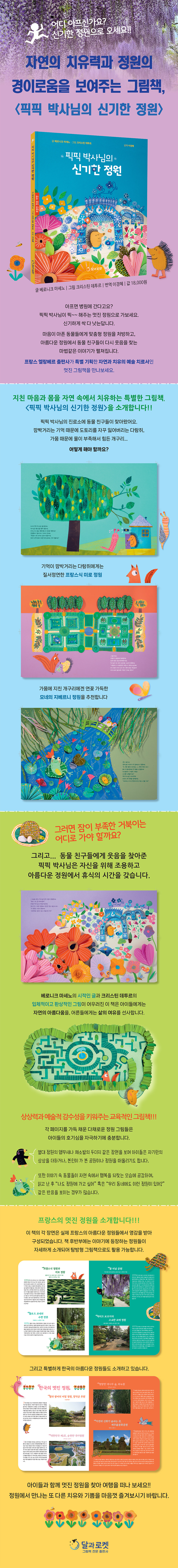 아프면 병원에 간다고요? 픽픽 박사님이 픽~~ 해주는 멋진 정원으로 가보세요.신기하게 싹 다 낫는답니다. 베로니크 마세노의 시적인 글과 크리스틴 데투르의 입체적이고 환상적인 그림이 어우러진 이 책은 아이들에게는 자연의 아름다움을, 어른들에게는 삶의 여유를 선사합니다. 각 페이지를 가득 채운 다채로운 정원 그림들은 아이들의 호기심을 자극하기에 충분합니다. 열대 정원의 앵무새나 채소밭의 두더지 같은 장면을 보며 아이들은 자기만의 상상을 더하거나, 본인이 가 본 공원이나 정원을 떠올리기도 합니다. 또한 이야기 속 동물들이 자연 속에서 행복을 되찾는 모습에 공감하며, 읽고 난 후 “나도 정원에 가고 싶어”혹은 “우리 동네에도 이런 정원이 있어?” 같은 반응을 보이는 경우가 많습니다. 이 책은 상상력과 예술적 감수성을 키워주는 교육적인 그림책입니다.