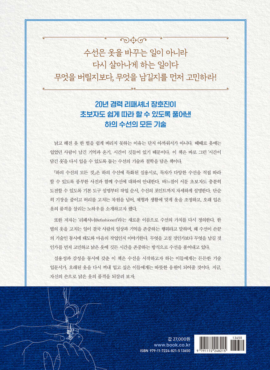 바지통을 늘리기 위해 덧단을 덧대는 작업은 원래는 기능적 필요에서 시작된 수선이다. 하지만 덧단은 단순한 보완이 아니라, 디자인의 전환점이 될 수 있다. 적절한 소재와 배치, 마감 방식에 따라 바지 전체의 인상이 새롭게 바뀔 수 있다. --- p.100 플레어 스커트는 허리선에서부터 밑단까지 퍼지듯 내려오는 곡선형 구조로, 실루엣의 아름다움이 곡선의 자연스러움에서 비롯된다. 따라서 플레어 스커트의 폭을 줄일 때에는 곡선의 흐름을 유지하면서 불필요한 부피만 줄이는 기술이 필요하다. ① 줄일 때는 허리선부터 단까지 일직선으로 플레어 스커트의 폭을 줄이는 경우, 허리선에서부터 밑단까지 직선으로 연결하여 줄이는 방식이 원칙이다. --- p.140 허릿단 봉제는 단순히 두 조각을 이어 붙이는 작업처럼 보일 수 있으나, 실제로는 몸판과 허릿단 간의 여유 조절, 너치 맞춤, 봉제 분할 처리 등 고도의 기술이 요구되는 작업이다. 특히 바지 형태를 좌우하는 허리선 부위이기 때문에, 꼼꼼한 고정과 단계별 봉제 방식이 중요하다. --- p.191 |