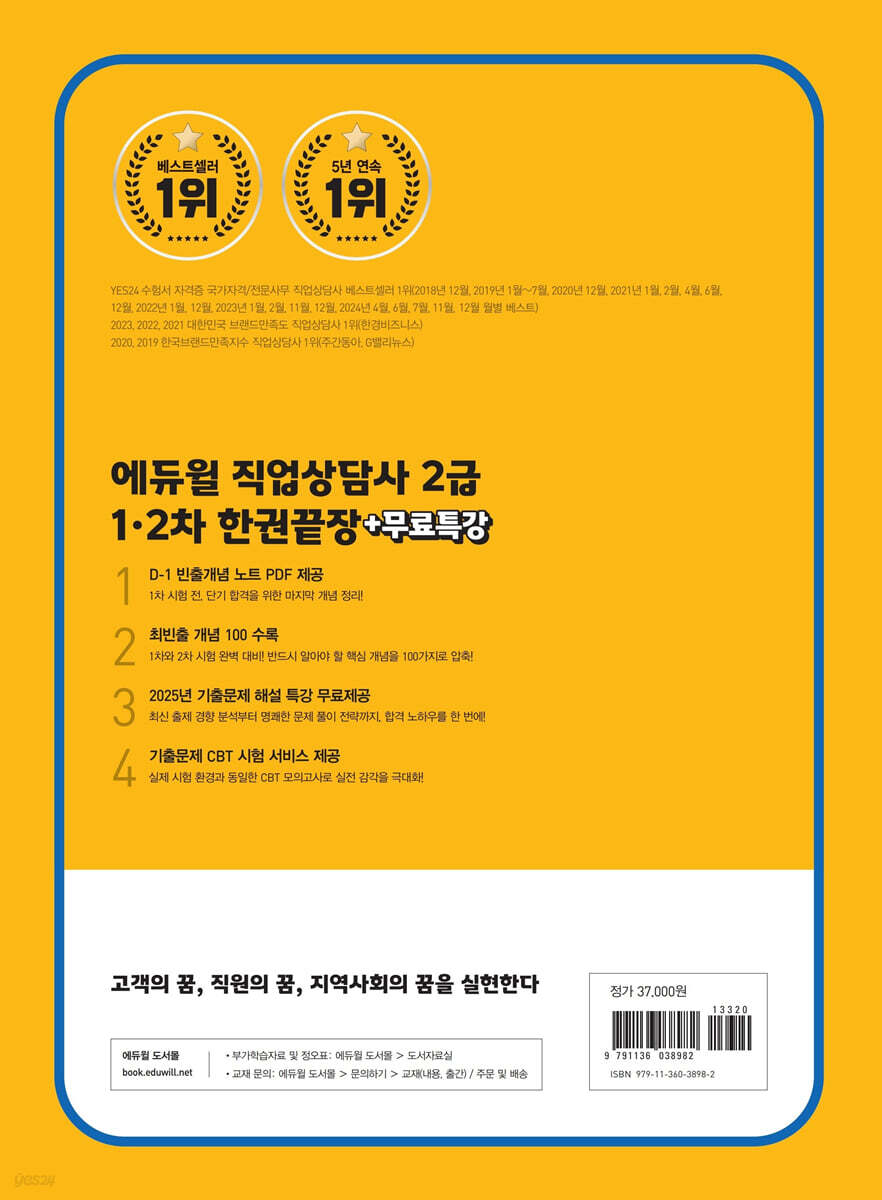 - 기출 기반 이론 정리와 핵심 기출문제 풀이로 기초 학습 단기 완성 2) CBT 복원문제로 실제 시험을 완벽 대비하는 기출편! - CBT 빈출문제 300제와 최신 기출문제 학습으로 안정적인 고득점 달성 3) 1, 2차 시험 대비가 가능한 풍부한 부가학습자료! - 1차(필기) 최신 25년 기출문제 해설 특강 무료 제공! - 1차(필기) 23~25년 기출문제 CBT 시험 무료 서비스 제공! - 1차(필기) D-1 빈출개념 노트 PDF 제공 - 2차(실기) 직업상담실무 최빈출 개념 100 별책부록 수록 - 단기 합격을 돕는 D-30일 학습 플래너 수록 |