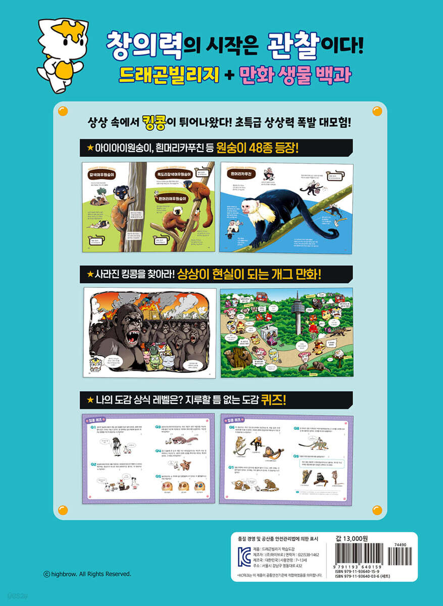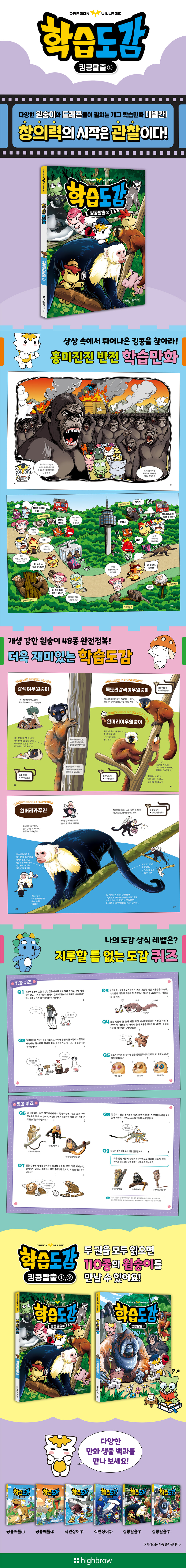 영화 제작자로 변신한 드래곤 친구들. 이번에도 어김없이 누군가에게 쫓기는데…! 그것은 바로 거대하고 무시무시한 킹콩! 고릴라, 침팬지, 여우원숭이, 거미원숭이, 긴꼬리원숭이 등 다양한 원숭이들과 펼치는 초특급 상상력 폭발 대모험! ● 아이아이원숭이, 흰머리카푸친 등 48종의 원숭이들이 모두 모였다! ● 상상만 하던 킹콩이 현실로 튀어나온다면? 재치 만점 개그 만화! ● 외모도 역할도 가지각색! 24마리 개성 만점 드래곤 캐릭터들! ● 위트 넘치는 그림으로 재미있게 배우는 학습도감! 재미있는 학습만화와 시각을 사로잡는 유익한 도감의 콜라보! 긴 꼬리를 가진 호랑이꼬리여우원숭이를 비롯하여 아이아이원숭이, 유령안경원숭이, 비단마모셋, 흰머리카푸친 등 지구상에 살고 있는 개성 강한 원숭이들을 한눈에 살펴본다. 드래곤 캐릭터들이 원숭이를 뒤쫓을 때마다 맞닥뜨리는 상황은 재미있는 개그 만화로 그려져 상상력에 날개를 달아 준다. 상상 속에서 튀어나와 도망친 킹콩을 찾으려는 드래곤들을 보며 평소 책에 관심이 없거나 다소 산만한 아이들까지 사로잡으며 집중력을 높인다. '드래곤빌리지 학습도감' 시리즈는 초등학교 교육 과정에서 필수적인 다양한 주제들을 다룬다. [킹콩탈출]에서는 영장목인 ‘원숭이’를 주제로 하여 흥미진진한 이야기와 함께 구성하였다. |