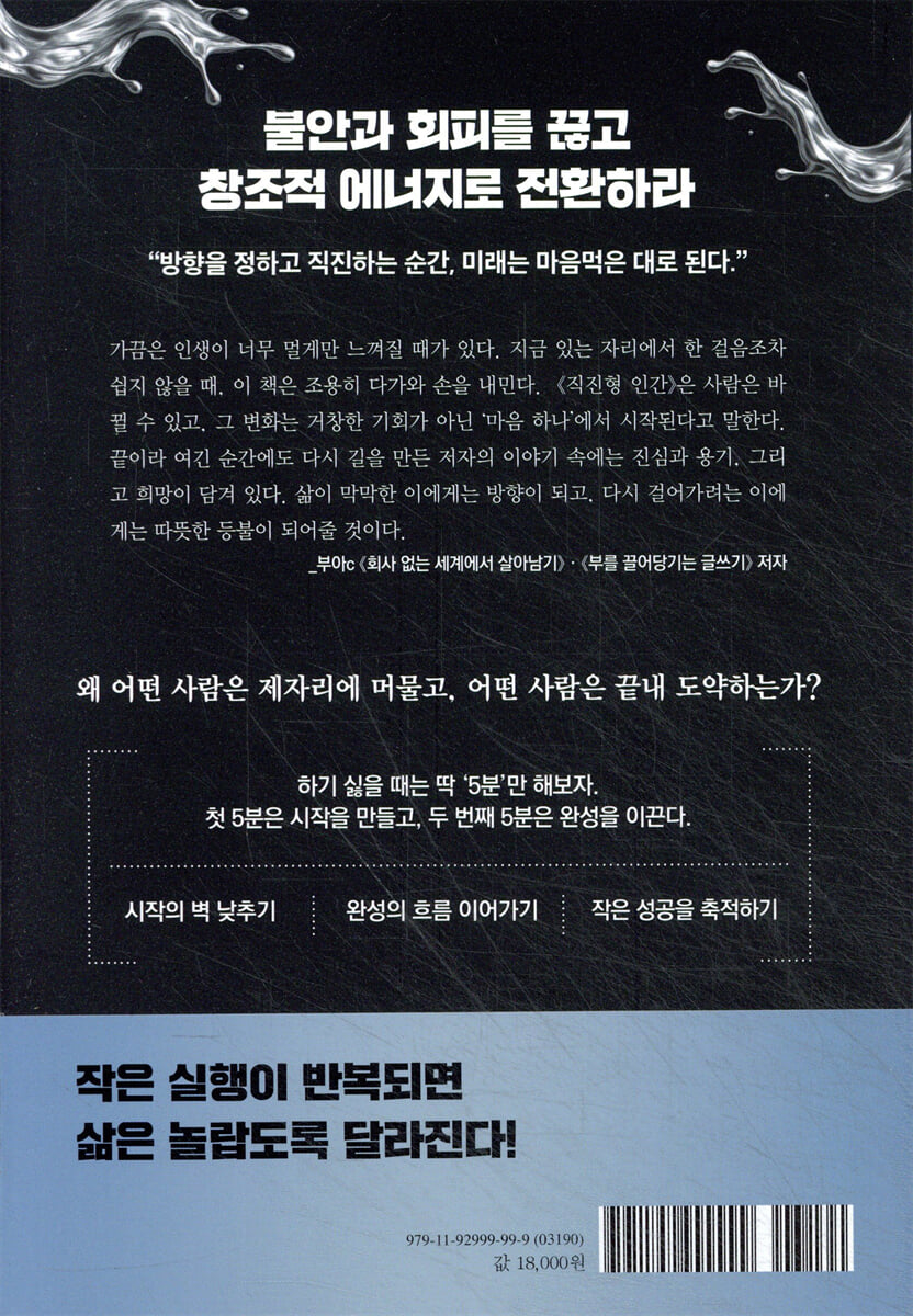 변화와 성장을 이끄는 힘은 어디에서 오는 걸까? 그 열쇠는 직진에 있다. 직진이란 방향을 분명히 세우고 멈추지 않는 꾸준한 행동이다. 직진형 인간은 주변의 소음과 유혹에 흔들리더라도 자신만의 길을 묵묵히 걷는다. 타인의 기준이 아니라 자기 내면의 목소리에 귀 기울이며, 그 울림을 따라 전진한다. 자기만의 중심을 세우고, 가능성을 믿으며, 잠재력을 실현하는 사람. 끝내 삶을 온전히 ‘자신의 것’으로 만들고 마는 존재, 그가 바로 직진형 인간이다.