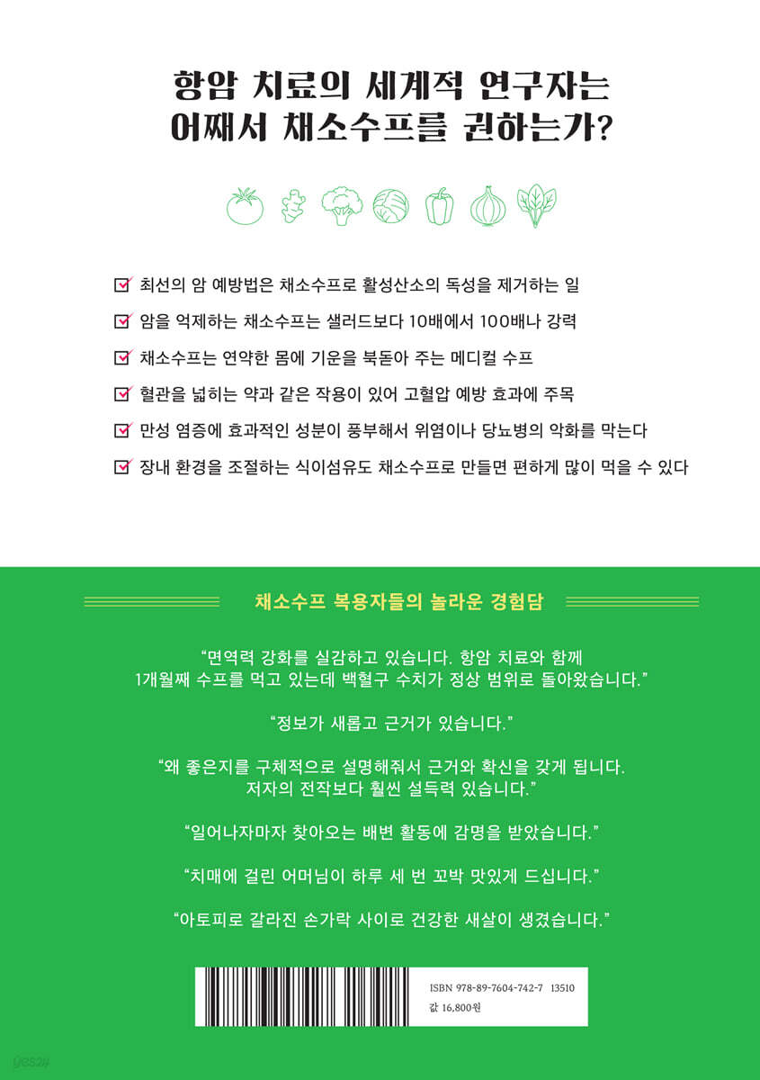 추천사 9 제1장 가장 간단하고, 가장 맛있는 채소수프 만들기 채소수프는 초간단! 19 | 사용하는 채소 20 | 물의 양과 채소 자투리 21 | 기본 조리법 22 | 포타주 수프 만드는 법 23 | 기본적인 섭취법 24 | 간 맞추기 25 | 만들어두고 보관하기 : 냉장 26 | 만들어두고 보관하기 : 냉동 27 | 채소 자투리로 만드는 채소 맛국물 28 제2장 채소수프 활용으로 누리는 ‘먹는 행복’ 채소수프 즐기기 짙은 녹색 잎사귀 수프 30 | 버섯이 듬뿍 들어간 수프 32 | 뿌리채소와 짙은 녹색 잎사귀 수프 34 | 배추과 채소로 만든 채소수프 36 | 아보카도가 들어간 채소수프 38 | 콩과 양상추 수프 40 | 여름 채소가 듬뿍 들어간 수프 42 | 비트와 토마토 수프 44 맛국물을 이용해 맛있게 만들기 다시마와 표고버섯 46 | 가다랑어포 47 | 치킨수프 48 | 조개 49 | 국물용 멸치 49 과일을 이용해 맛있게 만들기 과일을 넣으면 은은한 단맛과 산미가 첨가된다 50 볶아서 맛있게 만들기 기름으로 볶은 뒤 끓이면 감칠맛이 나오고 영양 흡수도 높아진다 51 체력 회복에는 고기, 생선, 우유도 함께 생선을 넣은 채소수프 52 | 고기를 넣은 채소수프 54 | 우유를 넣은 채소수프 56 맛있는 환자식 만들기 당근 수프 58 | 단호박 수프 59 만들어둔 채소수프 활용하기 포타주로 만드는 치킨카레 60 | 갈지 않은 수프로 만드는 죽 61 | 마에다 집안의 채소수프 생활 62 제3장 항암제 연구자인 내가 채소 수프를 권하는 이유 암 연구를 통해 밝혀낸 최선의 예방법은 채소수프로 활성산소의 독성을 제거하는 일 66 | 활성산소를 억제하는 채소수프는 샐러드보다 10배에서 100배까지도 강력하다 70 | 암 서바이버에게 추천하는 채소수프는 치료의 부작용을 줄이고 재발 방지를 돕는다 76 | 흉악한 활성산소를 없애 세포의 암 변화를 방지하는 것을 실험으로 확인하다 80 | 칼럼1 항암제 개발의 어려움과 내 연구 83 | 칼럼2 강압제나 항암제의 효과에 뒤떨어지지 않는 운동의 효과 88 | 칼럼3 마음가짐과 암 예방 및 치료 91 제4장 어린아이부터 고령자까지 약한 몸에 기운을 주는 메디컬 수프 채소수프는 잘 먹지 못하는 환자나 고령자에게 기운을 북돋아주는 메디컬 수프다 96 | 칼럼 4 식품 성분의 표시와 생체 흡수성에 대하여 103 | 칼럼 5 영양 보충을 위한 메디컬 수프에는 시판 제품도 활용해보자 104 제5장 몸 상태가 좋아지고 병이 개선된 독자들의 채소 수프 체험담 모든 사람에게 탁월한 효능은 아니지만 채소수프는 확실히 효과적이다 106 | 유방암 재발 예방에 채소수프 활용! 자연치유력 높이는 에너지를 느꼈다 108 | 입이 짧은 치매 어머니가 맛있게 식사! 다리와 허리에 힘이 붙어 웃음이 늘었다 114 | 건조해서 거친 피부가 촉촉하고 매끈매끈! 아토피 때문에 거칠어진 피부도 개선되었다 119 | 채소와 대화하는 듯한 채소수프를 통해 피부에 투명함이 생기고 다크서클도 옅어졌다 123 | 하루 세 번 화장실! 400이었던 중성지방 수치가 정상이 되고 당뇨병 수치도 안정되었다 126 제6장 채소 수프에는 혈관을 넓히는 유익균 향상 성분이 가득하다 채소에는 혈관을 넓히는 약과 같은 작용이 있어 고혈압 예방에 효과적이다 130 | 장내 환경을 조절하는 식이섬유도 채소수프로 만들면 편하게 많이 먹을 수 있다 133 제7장 채소 수프는 노화나 생활습관병의 원인인 만성 염증을 억제한다 혈관이나 장기를 서서히 손상시켜 동맥경화, 당뇨병, 암을 초래하는 만성염증이란? 138 | 채소수프는 만성염증에 효과적인 성분이 풍부해서 위염, 치주염, 당뇨병의 악화를 막는다 143 | 채소수프에 대해 자주 하는 질문 Q&A 146 맺음말 154 |