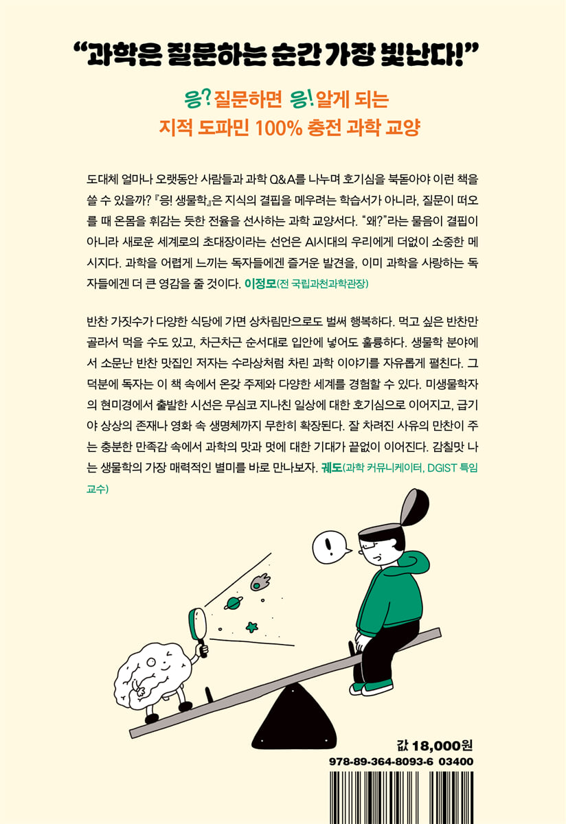 도대체 얼마나 오랫동안 사람들과 과학 Q&A를 나누며 호기심을 북돋아야 이런 책을 쓸 수 있을까? 『응! 생물학』은 지식의 결핍을 메우려는 학습서가 아니라, 질문이 떠오를 때 온몸을 휘감는 듯한 전율을 선사하는 과학 교양서다. “왜?”라는 물음이 결핍이 아니라 새로운 세계로의 초대장이라는 선언은 AI시대의 우리에게 더없이 소중한 메시지다. 과학을 어렵게 느끼는 독자들에겐 즐거운 발견을, 이미 과학을 사랑하는 독자들에겐 더 큰 영감을 줄 것이다. - 이정모 (전 국립과천과학관장)