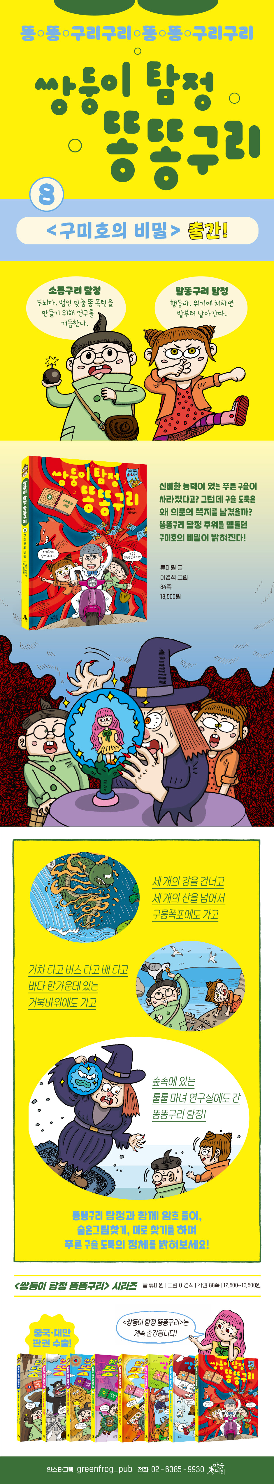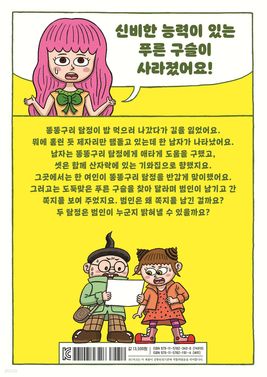 ●미션, 1년 안에 100가지 사건을 해결하라! 쌍둥이 탐정 똥똥구리의 정체는 말똥구리와 소똥구리이다. 이들이 탐정이 되어 사방팔방 뛰어다니는 이유는 단 한 가지! 옥황상제가 1년 안에 100가지 사건을 해결하면, 똥똥구리의 소원대로 영원히 사람으로 살 수 있게 해 준다고 했기 때문이다. ●들어는 봤나? 변신 탐정! 똥똥구리는 똥을 얹은 듯한 헤어스타일이 범상치 않다. 소똥구리 탐정은 똥에 대한 지식을 총동원하여 똥 폭탄을 제조하고, 말똥구리 탐정은 똥 굴리기로 단련된 다리로 멋진 발차기를 날린다. ‘변신 탐정’이란 설정은 이야기를 더해 갈수록 재미있는 역할을 한다. ●우린 쌍둥이, 둘이서 해결한다고! 똥똥구리는 똥부심으로 똘똘 뭉친 쌍둥이 남매이다. 최고의 똥 폭탄 기술자 소똥구리는 차분한 성격과 뛰어난 관찰력으로 사건을 풀어 가고, 최고의 발차기 선수 말똥구리는 엉뚱한 상상력으로 추리에 보탬이 된다. 둘이 함께라면 100가지 사건을 해결하는 건 시간문제라고! ●숨은그림찾기·수수께끼 풀며 추리력과 관찰력이 쑥쑥 이 책을 읽으면 쌍둥이 탐정 똥똥구리와 함께 암호를 풀고, 미로를 빠져나가고, 범인을 추리하고, 주요 단서를 찾아내는 등 여러 가지 미션을 풀어 볼 수 있다. 미션을 하나씩 해결해 가다 보면 금세 한 권을 뚝딱 읽게 되어, 독서에 흥미가 없는 어린이들도 성취감을 느낄 수 있다. 만화풍의 그림과 구성은 그림 구석구석을 살펴보는 재미를 준다. |