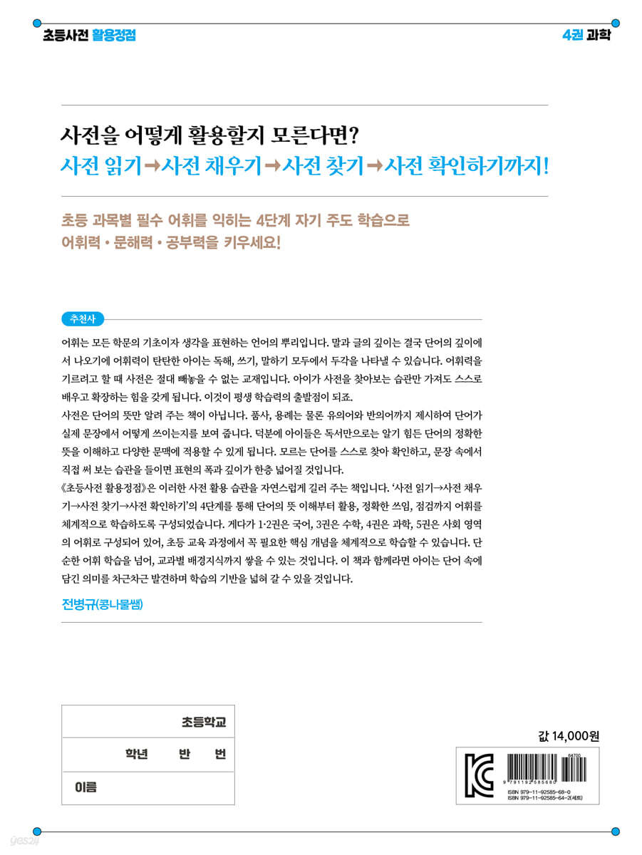사전 읽기 → 사전 채우기 →사전 찾기 →사전 확인하기까지! 초등 과목별 필수 어휘를 익히는 4단계 자기 주도 학습으로 어휘력·문해력·공부력을 키우세요! 초등 학습에 기초가 되는 필수 어휘 선정, 총 2,880개 어휘 수록 《초등사전 활용정점》은 총 2,880개 어휘를 담고 있습니다. 교과별 기본 학습 어휘를 중심으로 관련 어휘, 관용구, 한자, 사자성어와 속담을 구성하여 단편적인 어휘 학습으로 끝나지 않고 어휘력을 풍성하게 확장시킬 수 있습니다. 매일매일 키우는 초등 어휘력 《초등사전 활용정점》은 한 권당 25회차 학습 분량으로 구성되어 있으며, 하루 12~14개의 학습 어휘의 뜻을 정확하게 이해하게 하는 것을 목표로 1일 학습량은 사전 읽기 1장, 사전 채우기 1장으로 제시하였습니다. 먼저 사전 읽기 에서 어휘와 그 뜻을 읽고, 관련된 예문, 속담, 사자성어, 관용구를 익힙니다. 사전 채우기 에서는 문제를 풀어 배운 내용을 확인하며 어휘력을 탄탄하게 다집니다. |