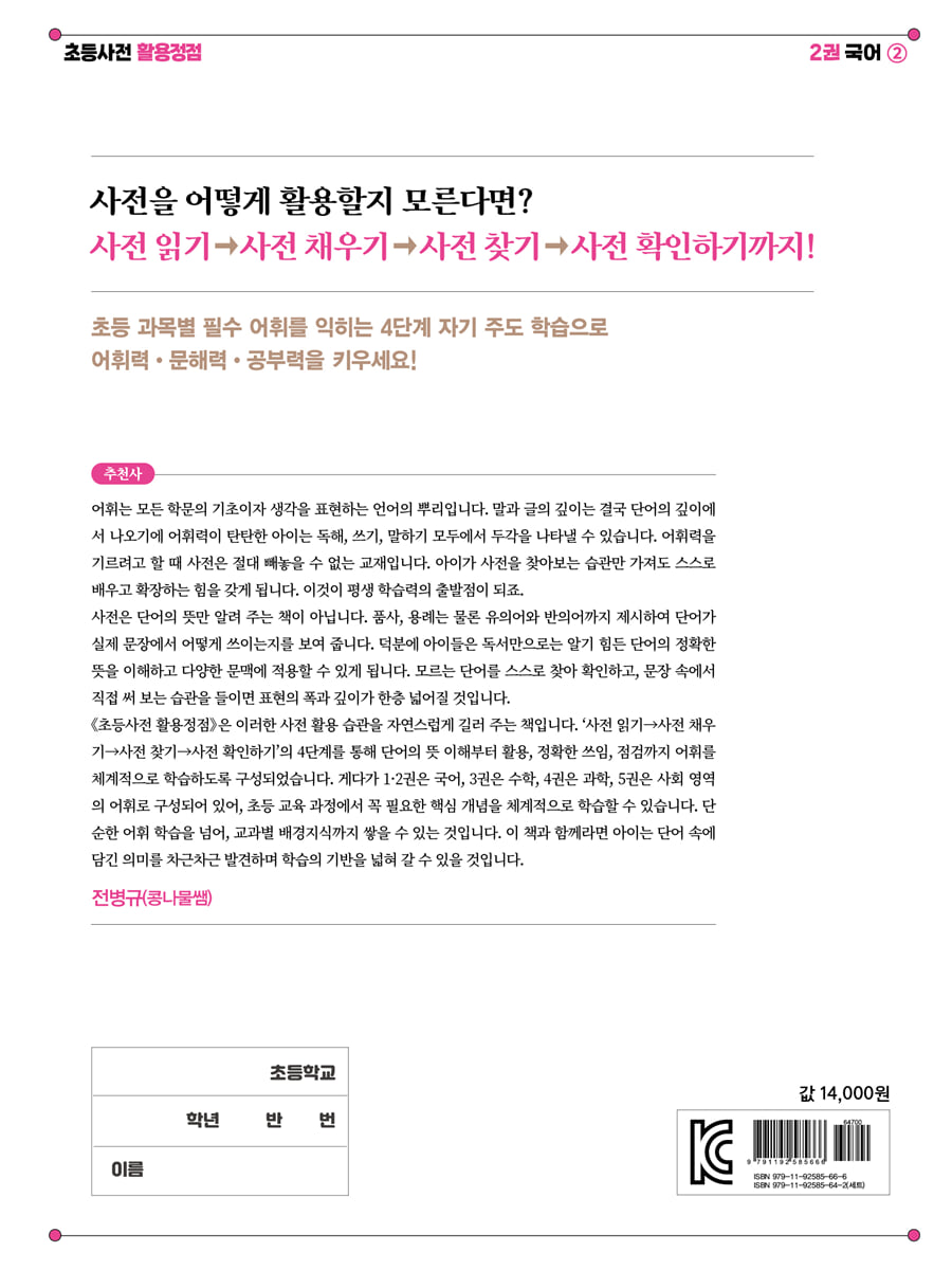 사전 읽기 → 사전 채우기 →사전 찾기 →사전 확인하기까지! 초등 과목별 필수 어휘를 익히는 4단계 자기 주도 학습으로 어휘력·문해력·공부력을 키우세요! 초등 학습에 기초가 되는 필수 어휘 선정, 총 2,880개 어휘 수록 《초등사전 활용정점》은 총 2,880개 어휘를 담고 있습니다. 교과별 기본 학습 어휘를 중심으로 관련 어휘, 관용구, 한자, 사자성어와 속담을 구성하여 단편적인 어휘 학습으로 끝나지 않고 어휘력을 풍성하게 확장시킬 수 있습니다. 매일매일 키우는 초등 어휘력 《초등사전 활용정점》은 한 권당 25회차 학습 분량으로 구성되어 있으며, 하루 12~14개의 학습 어휘의 뜻을 정확하게 이해하게 하는 것을 목표로 1일 학습량은 사전 읽기 1장, 사전 채우기 1장으로 제시하였습니다. 먼저 사전 읽기 에서 어휘와 그 뜻을 읽고, 관련된 예문, 속담, 사자성어, 관용구를 익힙니다. 사전 채우기 에서는 문제를 풀어 배운 내용을 확인하며 어휘력을 탄탄하게 다집니다. |