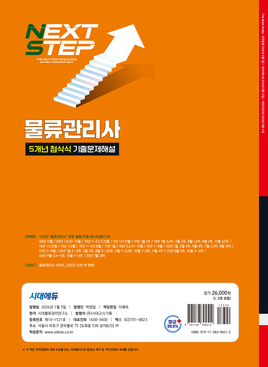 기출문제 풀이는 모든 시험 준비에 있어 시작이자 최종마무리가 됩니다. ‘2026 시대에듀 물류관리사 5개년 첨삭식 기출문제해설’은 시험을 처음 접하는 날부터 실제시험 당일까지, 기초이론부터 심화·응용단계까지 물류관리사 자격을 대비하는 모든 기간 동안 학습에 활용하는 수험서가 될 것입니다. 시대에듀는 수험생 여러분의 성공적인 합격을 기원합니다. |