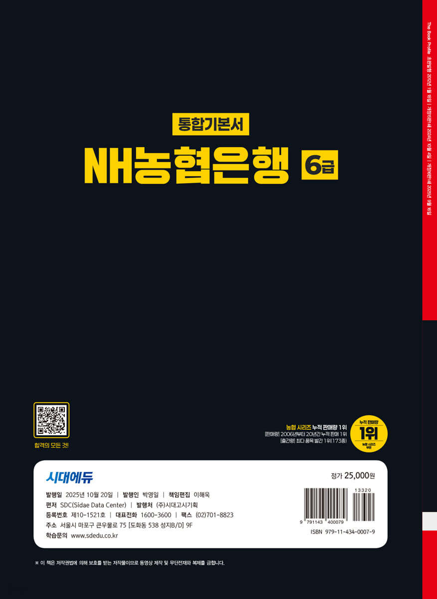 2024년 하반기에 시행된 NH농협은행 6급 기출복원문제를 수록하여 최신 출제경향을 한눈에 파악할 수 있도록 하였다. 직무능력평가 출제영역별 대표기출유형 및 기출응용문제를 수록하여 체계적인 학습이 가능하도록 하였다. 또한 직무상식평가 출제범위인 농업 · 농촌 및 디지털 상식뿐 아니라 금융 · 경제 상식과 IT 상식의 빈출키워드 및 기출응용문제를 수록하여 필기전형을 완벽히 준비할 수 있도록 하였다. 최종점검 모의고사 2회분과 도서 동형 온라인 실전연습 서비스를 통해 온라인 필기전형 전 자신의 실력을 스스로 평가할 수 있도록 하였다. 마지막으로 인 · 적성평가 모의연습과 NH농협은행 6급 실제 면접 기출질문을 수록하여, 한 권으로 채용 전반에 대비할 수 있도록 하였다.? 본서가 NH농협은행 6급 필기전형을 준비하는 여러분 모두에게 합격의 기쁨을 전달하기를 진심으로 바란다. |