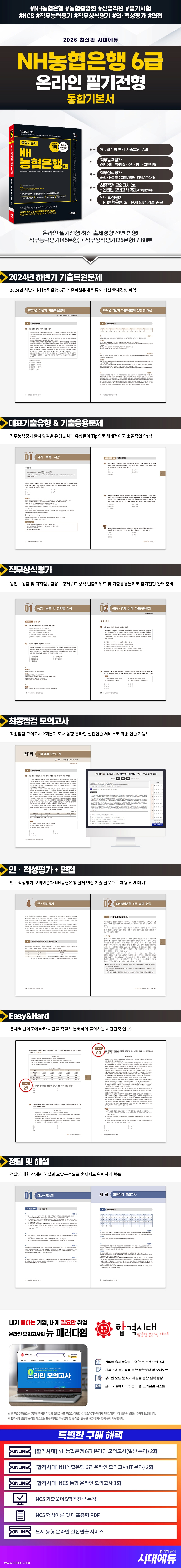 NH농협은행 6급 신규직원 채용 필기전형은 2023년부터 온라인으로 진행되고 있다. 이에 시대에듀는 NH농협은행 6급 온라인 필기전형을 준비하는 수험생들이 시험에 효과적으로 대비하도록 『2026 최신판 시대에듀 NH농협은행 6급 온라인 필기전형 통합기본서』를 출간하게 되었다.