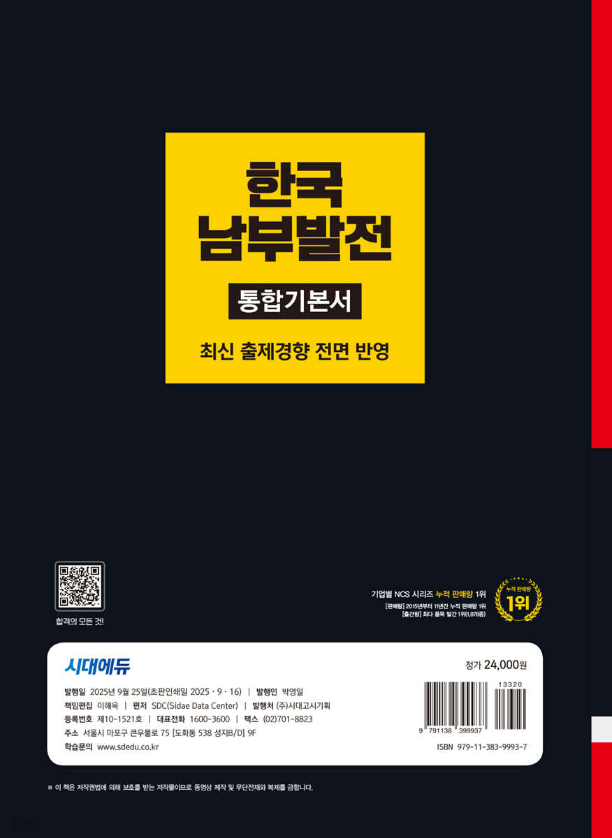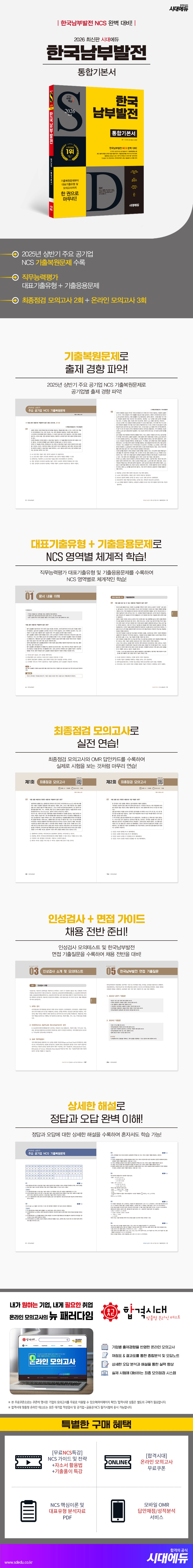한국남부발전 합격을 위해 시대에듀에서는 『2026 최신판 시대에듀 한국남부발전 통합기본서』를 출간하였다. 2025년 상반기 주요 공기업 NCS 기출복원문제를 수록하여 공기업별 출제 경향을 파악할 수 있도록 하였으며, 직무능력평가 대표기출유형 및 기출응용문제를 수록하여 NCS 유형별 학습을 할 수 있도록 하였다. 또한, 철저한 분석을 통해 실제 유형과 유사한 최종점검 모의고사를 2회 수록하여 실력을 점검할 수 있도록 하였으며, 한국남부발전 채용 가이드와 면접 기출질문을 수록하여 채용을 준비하는 데 부족함이 없도록 하였다. |
