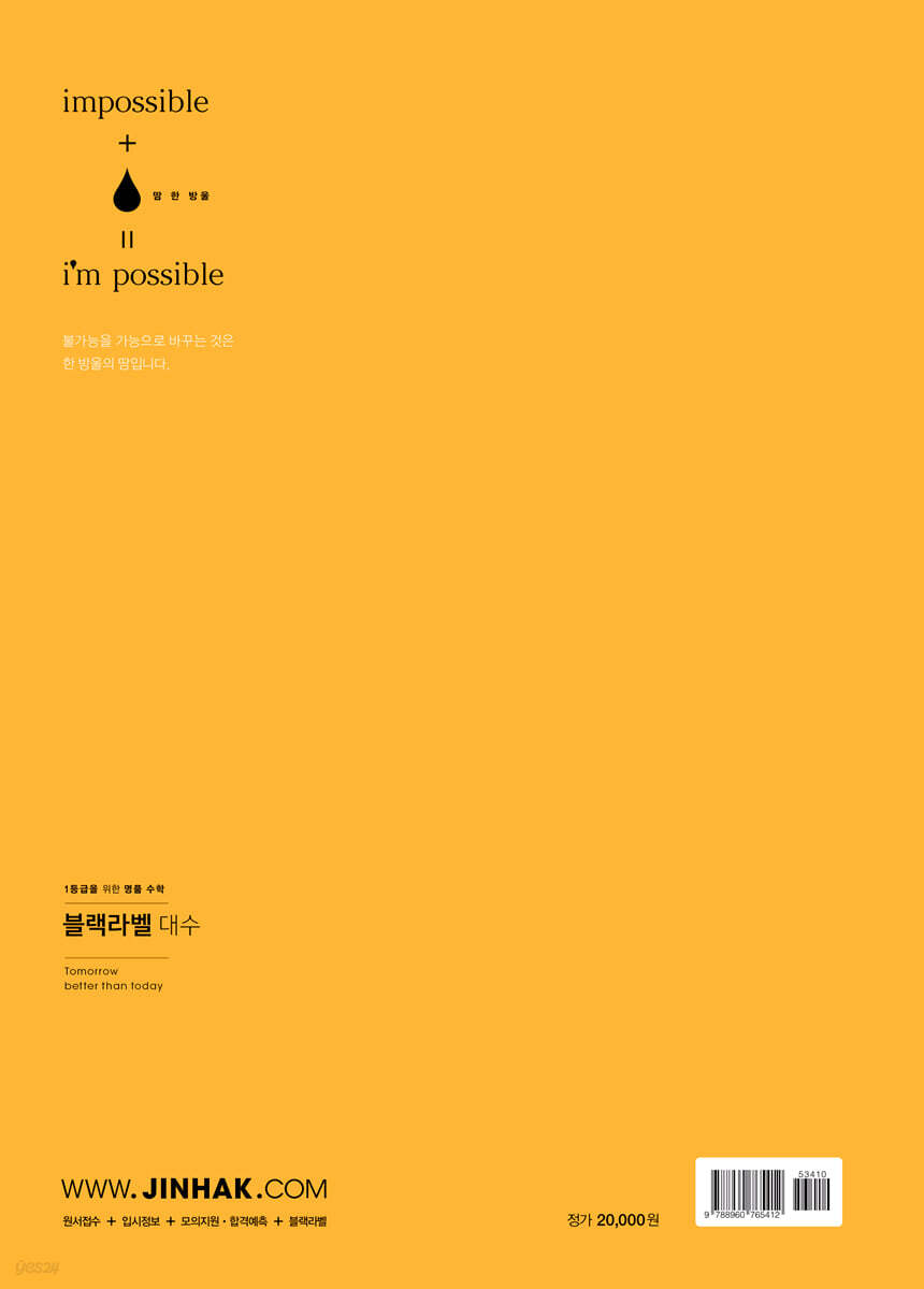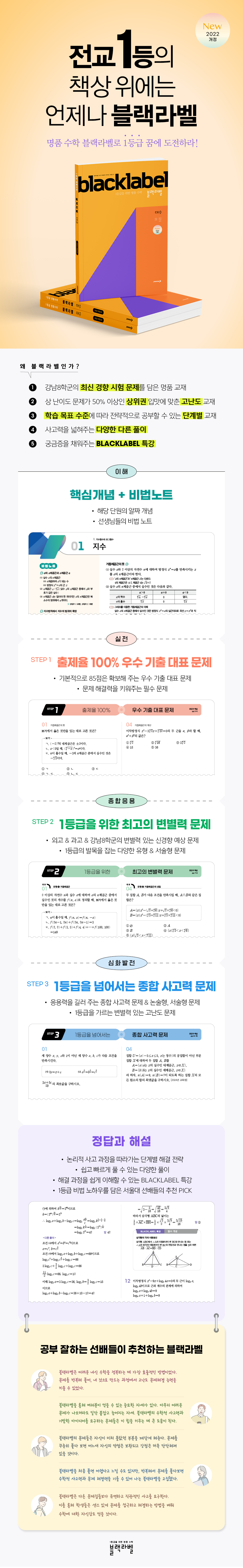 블랙라벨은 오직 최고의 제품에만 허락되는 이름입니다. 1. 특목고와 강남 8학군 교강사들이 집필한 수학 교재로, 양질의 문제 다양하게 수록 블랙라벨은 특목고와 강남 8학군의 교사와 명강사들이 함께 집필하고, 해당 학교의 학생들과 선배들이 직접 검토하여 추천한 명품 수학 교재입니다. 고빈출 기출 문제뿐만 아니라, 특목고와 강남 8학군의 독특한 내신 기출 문제와 교육청, 평가원, 수능 기출 문제까지도 포함되어 있어 수학적 사고력을 향상시킬 수 있습니다. 2. 고난도 문제 비율이 50% 이상인 다이아몬드식 문항 구성 블랙라벨은 기존 문제집과 차별화된 문항 구성을 자랑합니다. 변별력 있는 다양한 신유형의 고난도 문제들이 풍부하게 수록되어 있으며, 고난도 문제의 비율이 50% 이상을 차지하는 다이아몬드식 문항 구성을 갖추고 있습니다. 3. 단계별 학습 프로젝트로 수학 실력 증진 및 수학적 자신감 향상 블랙라벨은 1등급 달성을 위한 단계별 학습 프로젝트를 통해 학생들의 수학 실력을 체계적으로 향상시키고, 수학적 자신감을 증진시키는 비법서입니다. 블랙라벨은 기출 문제와 같은 질 좋은, 변별력 있는 우수한 문제들을 통해 수학 실력을 체계적으로 쌓을 수 있도록 설계되었습니다. 4. 명쾌한 해설과 다양한 풀이 방법을 통해 문제 해결의 흐름 파악에 용이 블랙라벨은 입체적인 해설을 제공합니다. 명쾌한 해설과 함께 단계별 해결 전략을 통해 문제 풀이의 흐름을 쉽게 이해할 수 있도록 하였으며, 다양한 풀이 방법과 차별화된 특강, 그리고 선배들의 노하우도 함께 제시되어, 학생들에게 문제 해결의 다양한 시각을 길러줍니다. 블랙라벨은 상위권 학생들을 위한 최적화된 수학 문제집으로, 고난도 문제 해결 능력을 극대화하여 1등급 목표 달성을 도와줍니다 |