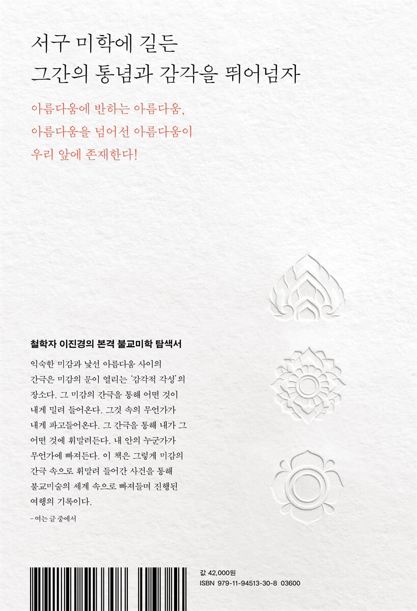 새롭고도 놀라운 본격 불교미학 탐색서 침묵 속에 존재하던 불교미술의 미감을 새로운 철학적 근거로 깨워 내다 불교미학이란 불교 예술작품에 응결된 미감에 대한 이론이다. 불교는 미추와 호오의 분별을 하지 말라는 교의로 인해 미학을 명시적으로 발전시키지 않았지만, 아시아 전역에서 극히 다양한 양상으로 수많은 ‘예술작품’을 남겼다. 그것을 그런 방식으로 만든 것도, 그 작품들을 보면서 우리가 느끼는 것도 분명 특정한 미감의 작용이다. 미학이란 이름의 지식이나 개념이 없어도 미학은 이렇게 작품들 속에 깃든 채 존재한다. 이 책은 이렇듯 불교 예술작품 속에 깃든, 말없이 존재하는 이 미감을 침묵에서 깨어나 말하게 하려는 시도다. ‘불교미학’이란 말을 처음 시도했던 것은 ‘한국의 미’로 잘 알려진 야나기 무네요시였다. 하지만 그가 거기서 실제로 찾아낸 것은 이름 없는 도공들의 미학, 민예품의 미학이어서 불교미학이라 말할 수 없다. 불교예술은 그처럼 작가 없는 작품도 많지만, 작가나 승려, 때론 국가마저 개입하며 의도적으로 조성된 것, 다기 같은 공예품만이 아니라 불상, 불화, 건축, 탑, 석굴 등 아주 다양한 영역에 걸쳐 있기 때문이다. 조선이나 일본, 중국은 물론이고 티베트나 태국, 캄보디아, 인도네시아, 그리고 ‘서역’이라 불리던 지역의 작가들은 나름의 멋진 작품들을 만들었다. 불교미술을 매개로 새롭게 넓히는 ‘동양’이라는 영역과 예술작품에 대한 미감 동양미학이나 동양사상 등을 연구할 때 ‘동양’이란 말로 중국, 한국, 일본 정도를 떠올리는 상상력은 사실 아시아 전역을 횡단하는 불교미학을 담아내기에는 너무 작은 그릇이다. ‘동양’이란 차라리 불교미술을 매개로 교류하고 혼합되며 지역마다 만들어진 문화적 영역 전체로 확장되어야 한다. ‘불교미학’이란 주제로 이 책이 시도하려는 것이 바로 이것이다. 물론 많은 문헌에서 불교미술에 대한 미적 평가를 해 왔으니 불교미학이 이미 있었던 것이라고 할 수도 있겠다. 그러나 그 평가는 가령 ‘비례’나 ‘사실성’, ‘숭고’나 ‘초월성’ 같은 개념을 통해 이루어졌고, 이는 서양미학에서 차용한 것이었다. 차용 그 자체가 나쁘다 할 순 없다. 그러나 이데아나 신 같은 초월자를 전제로 하는 세계의 미학적 개념을, 어떤 초월자도 없으며 모든 것은 관계에 따라 달라진다고 하는 세계의 미술작품에, 더구나 사실적 재현에는 별 관심이 없었고 익살을 위해 ‘웃기는 비례’를 즐겨 사용하고 미완인 듯한 작품을 만들던 세계의 미술작품에 그대로 차용하는 것은 대단히 부당한 것이다. 이런 기준에서 보면 언제나 이류의 비례미, 삼류의 사실성, 어느 것을 봐도 ‘그게 그거인’ 불상이나 불화를 벗어나기 힘들다. 새로운 기준으로 삼을 만한 탈식민주의적 미학 개념! 독자적인 미학적 개념이 없었다는 사실에서 야기된, 불교의 예술작품을 ‘그게 그거인’ 것처럼 여기는 미감이 자리 잡힌 데는 불가피한 면이 있다. 그러나 서구화를 문명화 혹은 개화로 간주하던 낡은 관념이나 서구적 감각을 판단의 척도로 삼던 서구 중심적이자 식민주의적 관점을 벗어나고자 한다면, 이와 반대로 지금까지 존재해 온 작품들이 저런 형상으로 추구하려던 미감이 무엇인지를 찾아야 한다. 작품 속에 깃든 미감을 개념화하여 그 작품들을 보고 ‘평가’하는 새로운 기준으로 삼아야 한다. 탈식민주의의 문제의식이 고창된 지 한참 지났지만, 미학에서 이런 시도는 국지적인 것을 넘어서지 못했다. 탈식민주의 시대에 불교예술을 통해 비서구적 미학을 새로이 정립하려는 이 책의 시도는 이런 의미에서 중요하다. 다음 문장은 이 시도를 요약해 주는 것이라 하겠다. “이 책에서 내가 하고자 하는 것은 다양한 불교미술 작품들에서 발견되는 미학적 특이성의 별자리들을 초월자가 사라진 내재성의 하늘에 그려 넣는 것이다. 성부와 성자, 성신에 대응할 비례, 재현, 숭고의 미학적 삼위일체가 다른 별들을 배경으로 밀쳐내며 눈부시게 빛나는 단순명료한 초월성의 하늘”을 대신하여 “별자리들이 제각각 빛을 내며 종종 이어지고 섞이며 때로 중첩될 만큼 인접한 내재성의 하늘”을 보게 될 것이다. -여는 글 중에서 서양 미학적인 기존 개념들을 뛰어넘어 재료와 형상이 함께 만드는 미학에 주목하다 이 책에서는 이런 문제의식에서 출발하여 서양 미학의 개념적 삼위일체라 할 ‘비례’와 ‘재현’, ‘숭고’를 벗어나고, 그리스주의적인 감각을 벗어나 불교미술, 나아가 동양미술을 볼 수 있는 개념들을 찾아 나선다. 즉 거대한 것에 압도당하며 발생하는 숭고를 대신해 상 없는 상을 형성하는 미시적 작용을 ‘미학적 여래’라는 개념을 제안하고, 예술에서 형상의 오랜 독재를 대신해서 재료와 형상이 함께 만드는 공작의 미학을 주목한다. 유클리드 기하학의 보편성을 대신하는 미감이 만드는 다른 유형의 기하학을 찾아내고, ‘완전성’에 반하여 불완전성이 갖는 힘, 그리하여 파격과 미완, 삐딱함과 공조하는 ‘대충의 미학’이 존재함을 보여준다. 더불어 건물과 마당이 서로를 만들어주는 호옹의 미학과 무한