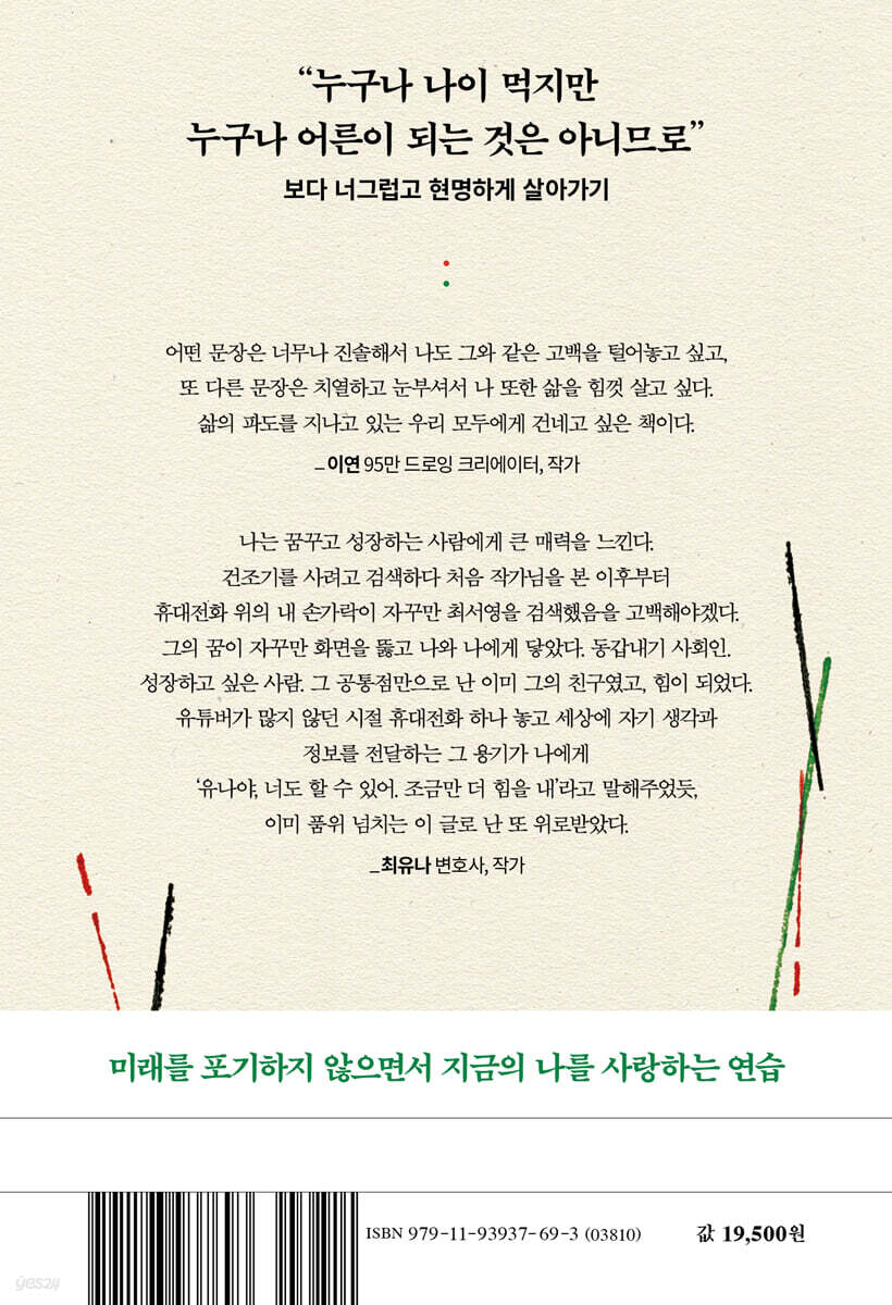 건조기를 사려고 검색하다 처음 작가님을 본 이후부터 휴대전화 위의 내 손가락이 자꾸만 최서영을 검색했음을 고백해야겠다. 그의 꿈이 자꾸만 화면을 뚫고 나와 나에게 닿았다. 동갑내기 사회인. 성장하고 싶은 사람. 그 공통점만으로 난 이미 그의 친구였고, 힘이 되었다. 유튜버가 많지 않던 시절 휴대전화 하나 놓고 세상에 자기 생각과 정보를 전달하는 그 용기가 나에게 ‘유나야, 너도 할 수 있어. 조금만 더 힘을 내’라고 말해주었듯, 이미 품위 넘치는 이 글로 난 또 위로받았다. - 최유나 (변호사, 작가)
