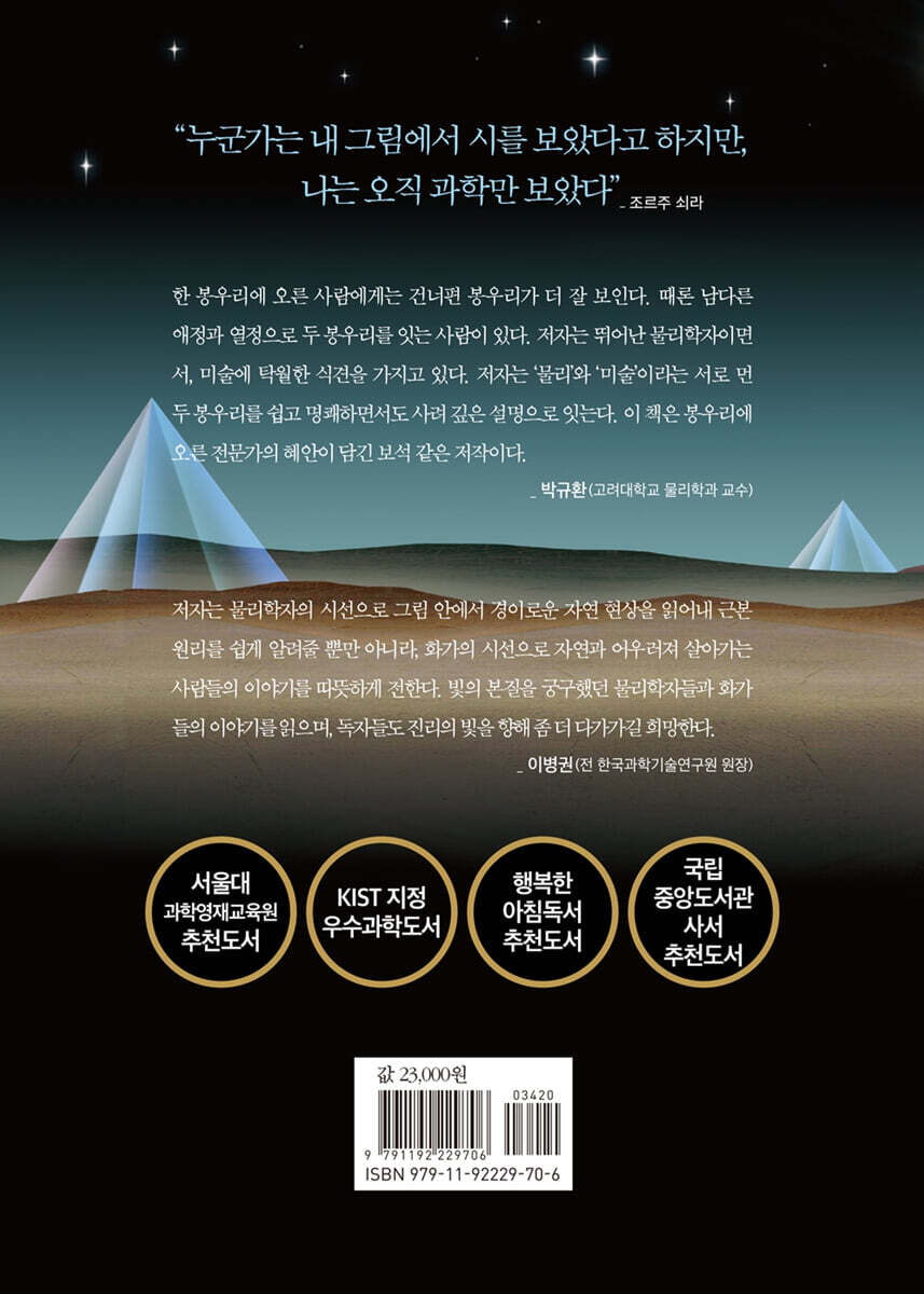 한 봉우리에 오른 사람에게는 건너편 봉우리가 더 잘 보인다. 때론 남다른 애정과 열정으로 두 봉우리를 잇는 사람이 있다. 저자는 뛰어난 물리학자이면서, 미술에도 탁월한 식견을 가지고 있다. 저자는 ‘물리’와 ‘미술’이라는 서로 먼 두 봉우리를 쉽고 명쾌하면서도 사려 깊은 설명으로 잇는다. 이 책은 봉우리에 오른 전문가의 혜안이 담긴 보석 같은 저작이다. - 박규환 (고려대학교 물리학과 교수)