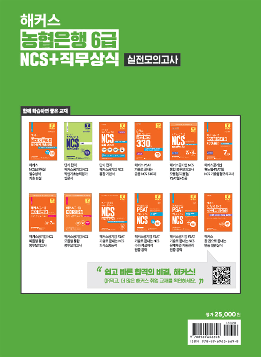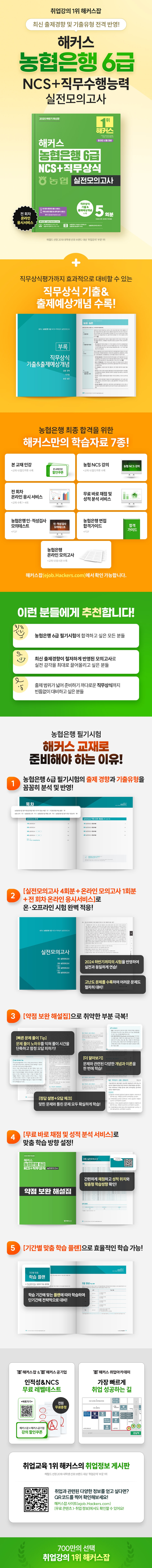 헤럴드 선정 2018 대학생 선호 브랜드 대상 '취업강의' 부문 1위 농협은행 6급 필기시험 최신 출제경향 및 기출유형 전격 반영! 실제 시험을 그대로 반영한 직무능력(NCS)+직무상식 실전모의고사로 단번에 합격! [이런 분들에게 추천합니다] 1. 농협은행 6급 필기시험에 합격하고 싶은 모든 분들 2. 최신 출제경향이 철저하게 반영된 모의고사로 실전 감각을 최대로 끌어올리고 싶은 분들 3. 출제 범위가 넓어 준비하기 까다로운 직무상식까지 빈틈없이 대비하고 싶은 분들 [해커스 교재만의 특장점] 1. 2024년 하반기 농협은행 6급 필기시험의 출제경향과 기출유형을 꼼꼼히 분석 및 반영하였습니다. 2. [실전모의고사 4회분+온라인 모의고사 1회분+전 회차 온라인 응시 서비스]로 오프라인 시험 환경과 더불어 온라인 시험 환경에 완벽 적응할 수 있습니다. 1) '실전모의고사'는 2024년 하반기까지의 시험을 전격 반영한 NCS(직무능력평가) 45문항, 직무상식평가 25문항 구성으로 실전과 동일한 연습이 가능합니다. 2) ‘실전모의고사’ 4회분 중 '3·4회'는 특별히 더 어려운 문제를 수록하여, 고난도 필기시험도 철저히 대비할 수 있습니다. 3. [직무상식 기출&출제예상개념]으로 직무상식평가까지 효과적으로 대비할 수 있습니다. 시험에 출제되었던 개념이나 출제가능성이 높은 개념을 정리한 '직무상식 기출&출제예상개념'을 교재 내에 수록하여, 출제 범위가 넓어 준비하기 까다로운 직무상식평가도 완벽하게 대비할 수 있습니다. 4. [약점 보완 해설집]을 통해 취약한 부분을 극복하고 단번에 합격할 수 있습니다. 1) 정답 설명+오답 체크 정답뿐만 아니라 오답의 이유까지 꼼꼼히 분석해주기 때문에, 맞힌 문제와 틀린 문제를 모두 확실하게 학습할 수 있습니다. 2) 빠른 문제 풀이 Tip 문제에 제공되는 Tip을 통해 문제 풀이 노하우를 익힘으로써 풀이 시간을 단축하고, 함정 오답은 피할 수 있습니다. 3) 더 알아보기 문제와 관련된 다양한 개념 및 이론을 한 번에 학습할 수 있습니다. 5. [무료 바로 채점 및 성적 분석 서비스]로 자신의 성적 위치를 파악하고 학습 방향을 확인할 수 있습니다. '약점 보완 해설집'에 수록된 QR코드를 인식하여 정답을 입력하기만 하면 간편하게 채점할 수 있는 것은 물론, 응시 인원 대비 자신의 성적 위치와 맞춤형 학습방향을 확인할 수 있습니다. 6. [기간별 맞춤 학습 플랜]으로 효율적인 학습이 가능합니다. 본 교재에서 제공하는 학습 플랜 중 자신의 학습 기간에 맞는 플랜에 따라 학습하면 혼자서도 단기간에 전략적으로 대비할 수 있습니다. [농협은행 6급 합격을 위한 해커스만의 추가 학습 콘텐츠 - 해커스잡(ejob.Hackers.com)] 1. 본 교재 인강(교재 내 할인쿠폰 수록) 2. 농협 NCS 강의(교재 내 할인쿠폰 수록) 3. 전 회차 온라인 응시 서비스(교재 수록 1~4회) 4. 무료 바로 채점 및 성적 분석 서비스 5. 농협은행 인·적성검사 모의테스트(PDF) 6.? 농협은행 면접 합격 가이드(PDF) 7.? 농협은행 온라인 모의고사(교재 내 응시권 수록) |