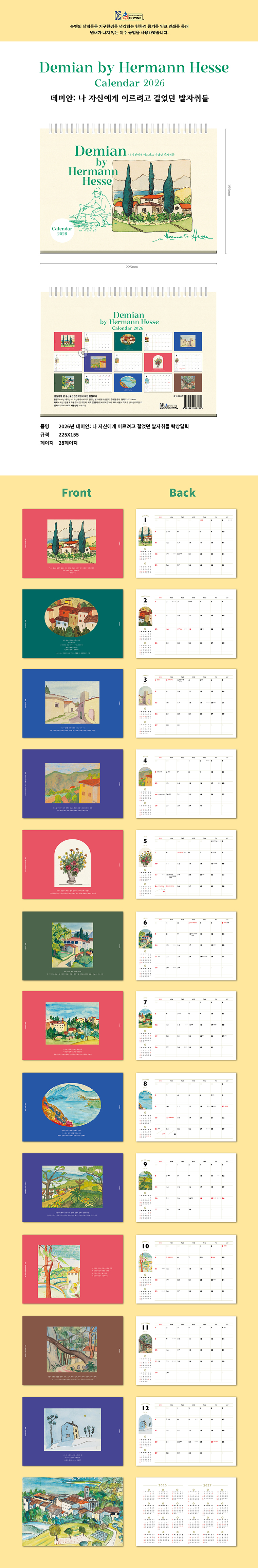 2월_ 새는 알에서 나오려고 투쟁한다. 알은 세계다. 태어나려는 자는 한 세계를 깨뜨려야 한다. 새는 신에게 날아간다. 신의 이름은 아브락사스다. 3월_ 나는 무언가를 하기 위해 존재하는 게 아니다. 나의 임무는 나의 운명을 발견하는 것이며, 그 운명을 온전히 끝까지 지켜내는 일이다. 4월_ 누가 밉다면 그가 나의 내부에 있는 그 무엇인가를 가지고 있기 때문이다. 나의 내면에 없는 것은 나를 화나게 하지 못하는 법이니까. 5월_ 저마다 자신만의 목표를 향해 날아가려고 치열하게 노력한다. 그래서 우리는 서로를 이해할 수는 있지만, 오직 자기 자신에 대해서만 설명할 수 있다. 6월_ 모든 인간은 자기 자신 이상이다. 유일무이하고 특별하며, 세계의 현상들이 시간 속에서 딱 한 번씩만 교차하는 엄청나게 놀라운 지점이다. 7월_ 꿈을 발견하면 길은 한층 쉬워진다. 하지만 영원히 계속되는 꿈은 없다. 계속 새로운 꿈으로 교체된다. 그러니 어떤 꿈에도 집착해서는 안 된다. 8월_ 한 번이라도 진짜로 살아보고 싶었다. 세상에 내 안의 뭔가를 꺼내 보이고, 세상과 진짜 얽혀서 다퉈보고 싶은 마음이 간절했다. 9월_ 우연이란 존재하지 않는다. 뭔가를 간절히 원해서 발견했다면 그건 우연히 이루어진 것이 아니라 너 자신이, 너의 필사적인 소원이 필연적으로 이끈 것이다. 10월_ 당신의 운명은 당신을 사랑하고 있다. 언젠가는 당신이 꿈꿨던 것처럼 완전히 당신 것이 될 것이다. 당신이 변함없이 충실하다면. 11월_ 가을에 나무는 낙엽을 떨구고 비가 오는지, 해가 뜨는지, 서리가 내리는지 전혀 느끼지 못하고 생명을 서서히 내면으로 움츠린다. 그 나무는 죽은 게 아니다. 기다리는 거다. 12월_ 나는 내 속에서 스스로 솟아나는 것, 바로 그것을 살아보려 했다. 그것이 왜 그토록 어려웠을까? |