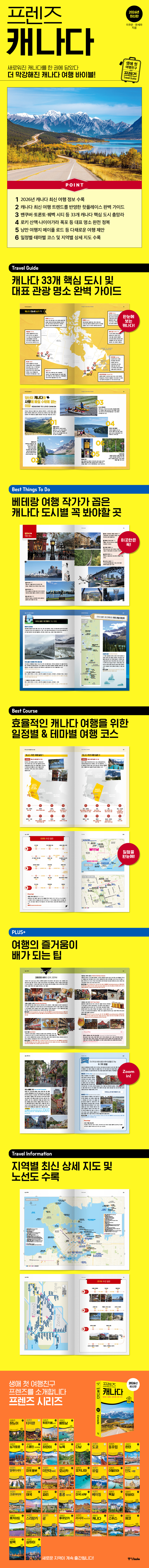 일러두기 캐나다 전도 #캐나다 알아가기 Things to know about Canada 캐나다 한눈에 보기 당신이 캐나다와 사랑에 빠질 수밖에 없는 이유 캐나다의 대표 도시 캐나다의 대자연 캐나다의 사계 캐나다의 즐길거리 캐나다 베스트 드라이브 코스 캐나다 최고의 전망 포인트 캐나다의 대표 음식 캐나다의 인기 체인 식당 캐나다의 커피 기행 캐나다 쇼핑의 세계 현지에서 사면 이득! 메이드 인 캐나다 캐나다 로컬 패션 브랜드 슈퍼마켓 & 드러그스토어 쇼핑 #알고 가면 좋은 캐나다 정보 Facts about Canada 한눈에 보는 캐나다 기본 정보 캐나다의 시간대 캐나다의 기후 캐나다의 역사 캐나다의 축제 캐나다 추천 여행 일정 - 캐나다 서부 일주 6박 8일 - 캐나다 로키 일주 6박 8일 - 캐나다 서부 + 로키 일주 9박 11일 - 캐나다 동부 일주 8박 10일 - 캐나다 단풍 여행 8박 10일 - 캐나다 스키 여행 5박 7일 #브리티시 컬럼비아주(BC주) BRITISH COLUMBIA 밴쿠버 [한 걸음 더] 서부 최고의 드라이브 코스, 시 투 스카이 하이웨이 [한 걸음 더] 바다와 하늘이 만나는 곳, 시 투 스카이 곤돌라 휘슬러 [한 걸음 더] 산과 호수의 만남 조프리 호수 빅토리아 [한 걸음 더] 정원의 여왕, 부차트 가든 - 덩컨 - 슈메이너스 - 너나이모 - 캠룹스 [한 걸음 더] 캐나다 서부 최대의 와인 산지, 오카나간 밸리 #앨버타주 ALBERTA 캘거리 [한 걸음 더] 오로라의 도시 옐로나이프 [특집] 캐나다 최고의 여행지, 로키 밴프 국립공원 레이크 루이즈 쿠트니 국립공원 요호 국립공원 [특집] 캐나다에서 가장 아름다운 드라이브 코스, 아이스필드 파크웨이 재스퍼 국립공원 롭슨산 주립공원 #온타리오주 ONTARIO 토론토 나이아가라 폴스 나이아가라 온 더 레이크 킹스턴 [특집] 세인트 로렌스강에 떠 있는 천 개의 섬, 사우전드 아일랜드 오타와 428 #퀘벡주 QUEBEC 몬트리올 [특집] 끝없이 펼쳐지는 오색 빛깔 단풍을 따라 떠나는 여행, 메이플 로드 퀘벡 시티 #애틀랜틱 캐나다 ATLANTIC CANADA [특집] 타이타닉에서 빨간 머리 앤까지, 애틀랜틱 캐나다 - 프레더릭턴 - 세인트 존 - 핼리팩스 - 샬럿타운 - 캐번디시 [한 걸음 더] 노바 스코샤주의 해안도로 라이트하우스 루트 #여행 준비 Preparing 여행 계획 세우기 항공권 예약하기 숙소 예약하기 도시별 숙소 잡는 요령 각종 서류 준비하기 예산 짜기 로밍 및 이심, 유심 준비하기 가방 싸기 실전 여행 Start to Travel 출국 및 입국하기 캐나다에서 이동하기 캐나다 시내 교통 이용하기 위급상황 대처하기 여행에 유용한 애플리케이션 인덱스 Index |