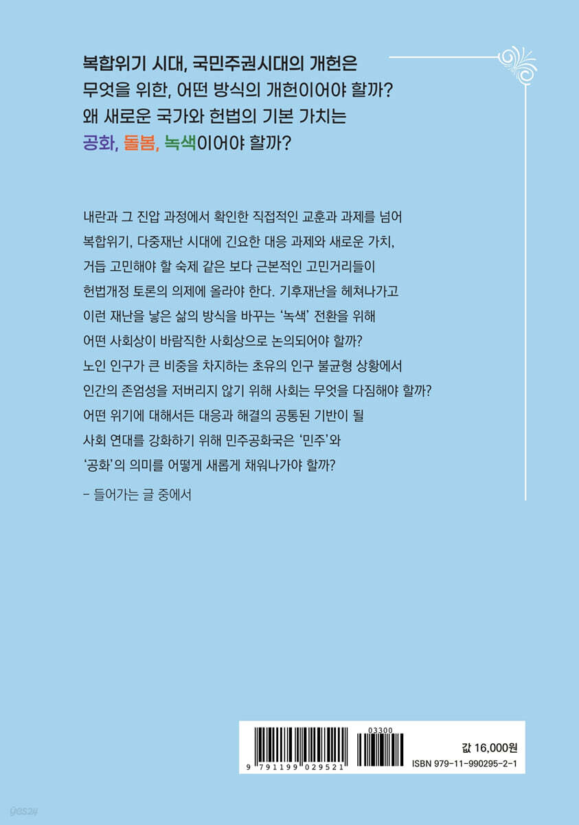 1장 공화 장은주 2장 돌봄 안숙영, 이나미 3장 녹색 김영준, 김은희, 우석영, 정규호 보론 지속가능성 위기에 대응하는 사회적 숙의 기구 제안 정규호 부록 대한독립선언서 (1919) 대한민국 임시헌법 전문 (1919) 대한민국 건국강령 총강 (1941) 대한민국 임시헌장 전문 (1944) 제헌헌법 전문 (1948) 6공화국 헌법 전문 (1987) 브라질 헌법 (2017) 에콰도르 헌법 (2008) 프랑스 자연환경 헌장 (2004) 참고문헌 미주 |