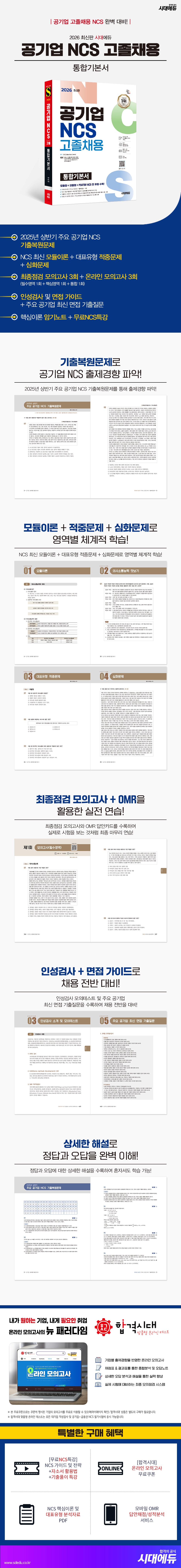 · Add+ 2025년 상반기 주요 공기업 NCS 기출복원문제 · PART 1 직업기초능력평가CHAPTER 01 의사소통능력CHAPTER 02 수리능력CHAPTER 03 문제해결능력CHAPTER 04 자원관리능력CHAPTER 05 정보능력CHAPTER 06 기술능력CHAPTER 07 조직이해능력CHAPTER 08 대인관계능력CHAPTER 09 자기개발능력CHAPTER 10 직업윤리 · PART 2 최종점검 모의고사제1회 모의고사(필수영역)제2회 모의고사(핵심영역)제3회 모의고사(통합) · PART 3 채용 가이드CHAPTER 01 블라인드 채용 소개CHAPTER 02 서류전형 가이드CHAPTER 03 인성검사 소개 및 모의테스트CHAPTER 04 면접전형 가이드CHAPTER 05 주요 공기업 최신 면접 기출질문 · 정답 및 해설Add+ 2025년 상반기 주요 공기업 NCS 기출복원문제PART 1 직업기초능력평가PART 2 최종점검 모의고사OMR 답안카드