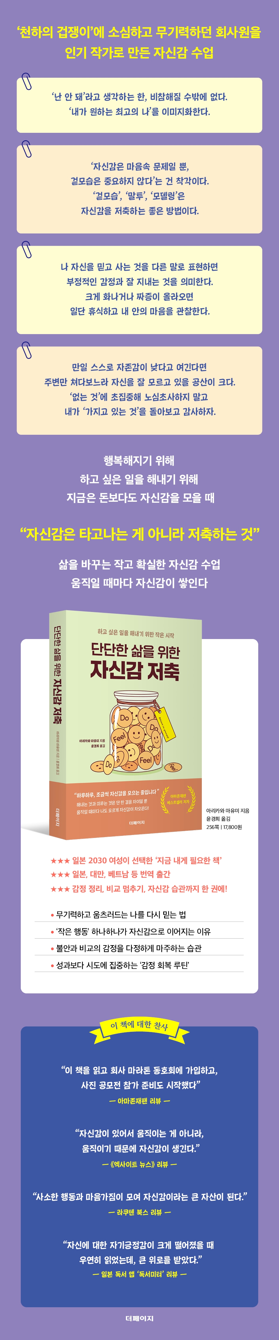 Prologue 자신감은 날마다 조금씩 쌓아 가는 것이다 1장. 누구든 실천할 수 있는 ‘자신감 저축’의 핵심 원리 9가지01 ‘일단 해 보자’를 습관화한다02 움직이기만 해도 저축이 된다 03 하고 싶은 것을 ‘하면’ 저축, ‘하지 않으면’ 빚 04 빚이 쌓여도 순식간에 갚을 수 있다 05 마이너스에서 탈출하면, 저축은 큰 폭으로 회복된다 06 한번 자신감을 잃었다고, 저축이 바닥나지는 않는다 07 조금 어려워 보이는 것에 도전하면, 특별 보너스 08 쌓아 둔 자신감은 언제 어디서든 사용할 수 있다09 ‘자신감 저축’에는 ‘Do 저축’과 ‘Feel 저축’이 있다 2장. 자신감 있는 사람의 남다른 ‘자신감 저축법’ 10가지10 성공은 크기보다 횟수가 더 중요하다 11 어려운 일을 하기보다 작은 일도 끝까지 한다 12 세상의 평가에 미련을 두지 않는다13 사람은 쉽게 변하지 않는다는 말을 믿지 않는다 14 싫지만 마지못해 하기보다 가슴이 시키는 일을 한다 15 남과 다른 일, 나만이 할 수 있는 일 하기 16 ‘난 안 돼’라고 생각하는 한, 비참해질 수밖에 없다 17 자신 없더라도 일단 자신 있게 행동한다 18 해 본 적 없어서 불안해도 자신감 제로는 아니다 19 ‘다른 사람만을 위해서’보다 내 선택을 따르기 3장. ‘자신감 제로’가 되지 않는 멘털 관리법 9가지20 평정심을 되찾고 ‘지금’에 집중하기 21 부정적인 감정이 가라앉길 기다리기22 내 의지로 통제할 수 있는 것에 집중하기 23 콤플렉스를 나만의 개성으로 승화시키기24 받아들이기 힘든 실패에서도 의미 찾기 25 미래를 걱정하지 않는 사람이 알고 있는 것26 좋아하는 일을 지속할 만한 자극 만들기 27 우회로를 즐길 줄 알면, 할 일이 많아진다28 ‘내려놓는 것’을 두려워하지 않기 4장. 인간관계에서 자신감을 저축하는 법 10가지29 두려움을 버리면, 애정과 신뢰가 싹튼다30 기쁘게 베풀면, 자신감도 두둑해진다 31 남에게 신경 쓰기보다 나부터 마음을 열자32 상대방이 하지 않길 바라는 것은 나도 하지 않기33 ‘남을 용서하는 마음’이 필요할 때가 있다 34 타인을 대하는 방식을 바꾸면 자신감도 ‘짤랑’ 35 ‘NO’라고 확실히 말하기 36 ‘마음이 놓이는 관계’에서 자신감이 샘솟는다 37 나와 다른 타입의 사람과 만나기 38 편안함의 틀을 깨고 변화에 익숙해지자 5장. 자신을 믿고 멋진 인생을 만드는 법 8가지 39 한 치 앞을 모르는 인생, 일단 한 걸음 내디뎌 보자 40 자신 없고 두렵다면, 잘 되는 방법을 배우자41 이미지를 그리면, 실현할 힘도 생긴다42 도전하는 모습만큼 매력적인 것도 없다43 지금, 여기에 집중하는 감각을 기르자44 그래도 야망이 있는 편이, 인생은 재미있다 45 나만의 미학을 가지고 행동한다 46 ‘나는 훨씬 더 멋지다’라고 믿고 행동하자