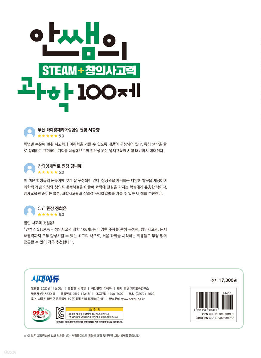 『안쌤의 STEAM + 창의사고력 과학 100제』는 과학적 지식뿐만 아니라 현상이나 사실을 과학적으로 분석하고, 추산하며 다양한 아이디어를 내어 창의성을 기를 수 있습니다. 『안쌤의 STEAM + 창의사고력 과학 100제』가 학생들에게 조금 더 쉽고, 재미있게 STEAM을 접할 수 있는 기회가 되었으면 합니다. |