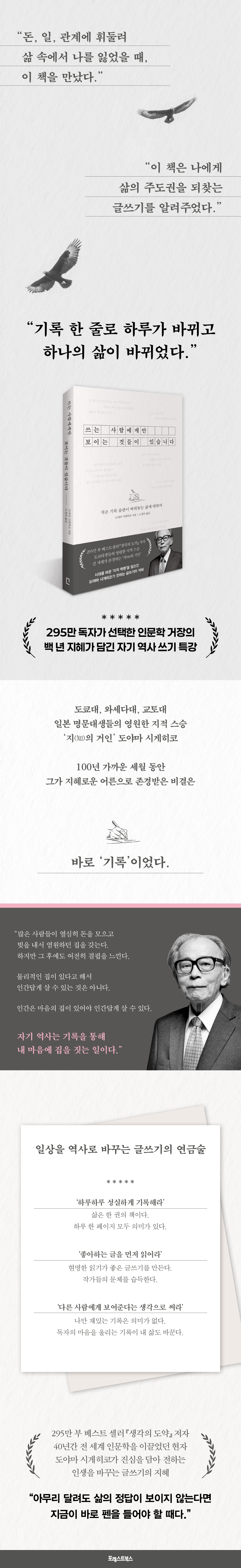 1부 모든 삶은 역사다 글로 지은 마음의 집 나를 알고 글을 쓴다 순서를 바꾸는 글쓰기 삶이라는 은유 2부 좋은 쓰기를 위한 현명한 읽기 고전의 지혜를 빌리다 이것은 자서전이 아니다 문학이 되는 생애 가장 담백한 일기 산뜻하고 발랄한 유머 내 삶의 애호가 간결함의 미학 일기 쓰는 보람 삶과 역사의 교차로 추억을 사진에 담아 나의 옛날 이야기 피와 살이 되는 기록 말할 수 없는 비밀 한 줄에 담긴 죽음 3부 기록을 나누는 기쁨 가장 신비로운 종이 글쓰기의 도구들 한 권으로 만드는 인생 나가며 누구나 읽고 싶은 나의 삶 |