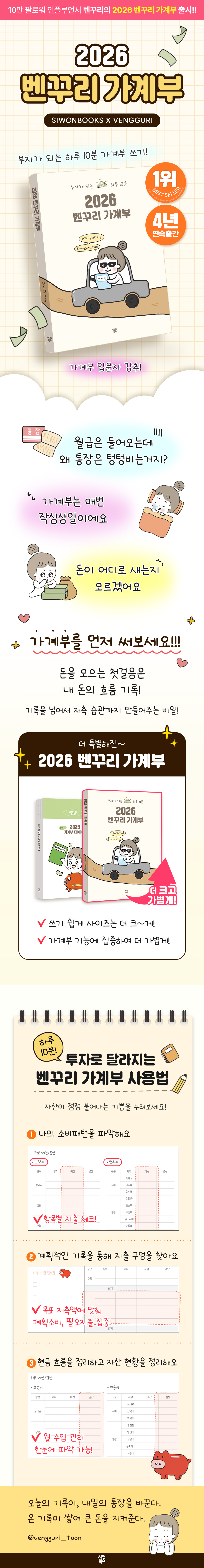 1. 더 커진 가계부 : 누구나 쓰기 쉽게 더 크게! 내지 종이 기준 150*225mm → 188*257mm 2. 가계부 기능에 집중 : 기존의 ‘가계부+다이어리’ 혼합 기능이 아닌 가계부만 슬림하게 수록 3. 정가 인하 : 기존의 다이어리 속지를 빼고 가계부만 수록하여 정가 인하 및 30% 추가 할인 재테크의 기본은 지출 관리다. 인스타그램 재테크툰으로 유명한 ‘돈모으는 벤꾸리’는 ‘직장인 점심값 80% 아끼는 꿀팁’, ‘돈 모으는 가계부 쓰는 법’ 등 생활 밀착형 콘텐츠로 많은 공감을 얻었다. 실생활에 유용한 절약 꿀팁뿐만이 아니다. 벤꾸리 작가는 돈을 왜 모으는지, 돈보다 더 중요한 것은 무엇인지 가족을 통해 깨닫게 된 에피소드를 소개해 깊은 감동을 전하기도 했다. 벤꾸리 작가는 자신의 가계부를 만들면서 가계부를 쓰는 사람들에게 365일 매일매일이 소중하게 여겨지길 바라는 마음을 담기 위해 노력했다. 자신이 실제로 사용해온 가계부 양식의 아이디어와 노하우를 누구나 쉽게 사용할 수 있도록 새롭게 정리했다. ‘연간 플래너 경조사 체크하기’부터 ‘예산/결산’ 페이지를 수록해 계획적인 소비와 리뷰, 현금 흐름과 자산 현황을 파악할 수 있도록 했으며, 일 가계부와 주간 결산뿐 아니라 1년간의 수입, 지출, 투자, 저축 현황을 정리할 수 있는 ‘연간 결산’을 함께 담았다. 예산 짜기 → 지출 관리 → 결산을 통해 자산이 점점 불어나는 기쁨! 1 . 예산 짜기 (STEP 1) 경조사 정리하기 (STEP 2) 가계부의 첫걸음 예산 짜기 (STEP 3) 지출 일정 정리하기 2. 수입/지출 기록하기 (STEP 1) 수입 및 지출 내역 정리하기 (STEP 2) 주간 결산하기 3. 결산하기 (STEP 1) 월간 결산하기 (STEP 2) 현금 흐름도 (STEP 3) 자산 결산 새해도 돈 모으는 벤꾸리와 함께 가계부를 함께 써보자! |