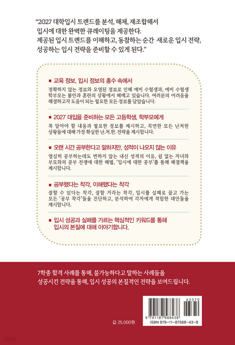 --- p.20, 본문「아는 만큼 보이는 입시」중에서 공부를 열심히 하는 것과 ‘잘’하는 것은 다른 이야기입니다. ‘공부 잘하고 있냐’고 질문을 하면 대부분의 학생들은 승우의 경우처럼 열심히 하고 있다고 대답을 합니다. 열심히, 최선을 다해서 등등 좋은대답입니다. 하지만, 추상적인 대답일 뿐입니다. 냉정하게 말하면 대학이 선발하는 학생은 열심히 하는 학생이 아닙니다. 많은 학생이 착각하는 부분이긴 하지만, 대학은 열심히 하는 학생을 선발하는 것이 아니라 ‘잘하는’ 학생을 선발합니다. 잘하는 학생을 선발한다는 말은 대학이 사용하는 ‘역량(competence)’이라는 단어에서 알 수 있습니다. 역량은 능력보다는 상위의 개념입니다. 무언가를 할 수 있다는 말 보다는 경쟁을 통해 잘하게 됨을 의미하는 단어입니다. --- p.36, 본문「아는 만큼 보이는 입시」중에서 학생부 교과 전형에서 유의해야 할 점 중의 하나는 ‘진로 선택 과목’의 반영 방법이 대학마다 다르기 때문에 수험생들에게 유불리 발생할 수 있다는 점입니다. 대체로 진로 선택 과목의 반영 방식은 ‘대학별 환산 등급’, ‘환산 점수’, ‘가산점 방식’, ‘정성적 평가’로 구분할수 있습니다. 진로 선택 과목의 반영 방식에 따라서 실제 평가에서는 합불에 영향을 미치기도 하므로 자신에게 유리한 방식을 반영하는 대학을 찾는 것도 중요합니다. --- p.87, 본문「2027 입시 준비를 위한 정보」중에서 서울대의 교과 평가는 수능 성적만으로 1단계에서 2배수를 선발한 뒤 2단계에서 교과 평가 20%를 반영합니다. 현재의 수능 성적을 고려하면 2배수 선발이라고 하더라도 수능 문항 2문항 이내의 차이일 것입니다. 결국 수능 성적 차이가 크긴 하지만, 어느 정도 역전이 가능하다는 결론이 나옵니다. 이론상으로는 수능 만점자도 교과 평가가 매우 부실하다면 불합격할 수도 있기 때문입니다. --- p.146, 본문「2027 입시 준비를 위한 정보」중에서 학생부 교과 전형은 정성적인 평가 요소와 면접 등의 요소들이 다분히 있지만, 그럼에도 정량적인 평가를 기본으로 합니다. 개인적으로는 내신 성적을 ‘자격 기준’으로 표현합니다. 개별 대학의 내신 합격선을 확인하면 그 대학에 학생부 교과 전형으로 지원을 할 수 있는 자격을 주는 셈입니다. 일단은 자격을 가져야만 원서를 쓸 수 있다는 말입니다. 특히나, 다양한 평가 요소를 가진 학생부 교과 전형의 성격을 생각하면 자격 기준으로서의 역할은 점점 더 강화되는 셈입니다. --- p.172, 본문「전형별 입시 전략 수립하기」중에서 2027 학년도 대학 입시 트렌드를 분석할 때, 학생과 학부모들에게 가장 많이 받는 질문 중에 하나는 ‘재수 가능’ 여부입니다. 재학생인데, 2027 입시를 준비하는 예비 수험생인데 이미 재수를 염두에 두고 이야기를 합니다. 그리고 재수의 유리함 혹은 불리함에 대해서 묻는 것입니다. 재수생의 증가와 삼수생의 증가 등으로 대표되는 현재의 흐름 속에서 부모들의 고심 또한 충분히 이해가 됩니다. 이러한 입시상황을 생각해 보면 2027 입시 트렌드 분석을 위해서는 꼭 필요한 전제이긴 합니다. 그러나 대학의 목적은 항상 우수한 학생을 선발하는것입니다. 그러니 수험생들은 ‘진학’이라는 점에 중점을 두고 입시를 준비하면 해야 할 것들이 매우 선명하게 보입니다. --- p.322, 본문「2027 대학입시 트렌드 분석」중에서 서울대, 연대, 고대의 전체적인 입시 흐름은 서울대와 고대는 “유지”, 연세대는 “변화”로 나타나고 있습니다. 특히, 연대가 전형에 다소 큰 변화를 주고 있다는 점은 유심히 살펴야 할 부분입니다. 전체 모집 인원은 큰 변동이 없으며, 수시와 정시의 비율도 그리 큰 차이는 없습니다. 전체적으로 보면 11,625명을 선발하고 그 중 60% 정도를 수시로, 나머지 40% 정도를 정시로 선발합니다. 2027학년도 전체 수험생이 47만 명 정도가 될 것으로 예상된다면, 약 2.4% 수준의 학생을 선발 한다는 말입니다. 학생들에게 항상 하는 말이기도 합니다. --- p.339, 본문「트렌드-SKY」중에서 첨단 학과는 정부가 첨단 분야의 인재 양성을 위해 관련 학과의 입학 정원을 대폭 확대하면서 입시에서 중요한 변수로 부상 중에 있습니다. 전통적인 첨단 학과들은 대체로 AI, 빅 데이터, 미래 자동차, 반도체, 바이오 헬스 등이고, 최근에 신설되는 학과들로는 양자 컴퓨터, 지능형 AI 등입니다. 의대 증원과 관련된 이슈들이 초강력한 상황이라서 주목을 덜 받는 경향이 있긴 하지만, 상위권 대학 혹은 학과를 노리는 학생들에게는 대단히 메리트 있는 학과임에는 분명합니다. 물론 첨단 학과로 진학한 후에 반수 등의 문제점이 지속적으로 발생하고 있긴 하지만, 그럼에도 급변하는 미래 사회를 이끌어갈 첨단 분야의 인재를 양성한다는 측면에서 매우 중요한 학과입니다. --- p.374, 본문「트렌드-첨단학과」중에서 학교의 프로그램을 기획하고, 학생의 성장을 위한 다양한 방법과 과정을 수행하지만, 입시 지도 자체가 목적이었던 적은 없습니다. 너무 당연하게도 ‘입시 결과’는 학생의 성장의 결과일 뿐입니다. 많은 성장이 이뤄지면, 입시 결과는 당연히 좋아지게 됩니다. 많은 성장을 이