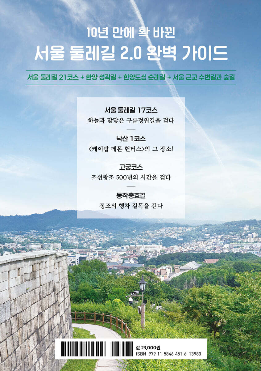초판 서문 사계절 걷기 좋은 서울 둘레길 여행, 준비되셨나요? 둘레길 살펴보기 이 책의 활용법 걷기 여행을 위한 TIP INDEX PART 01 서울 둘레길 21코스 1코스 수락산 참나무 오형제가 이웃한 숲길(도봉산역 → 당고개공원 갈림길) 2코스 덕릉고개 도시와 자연을 잇는 생태길(당고개공원 갈림길 → 상계동 나들이철쭉동산) 3코스 불암산 하늘을 품은 포근한 소나무 숲길(상계동 나들이철쭉동산 → 화랑대역) 4코스 망우 · 용마산 도시와 자연을 잇는 나들이길(화랑대역 → 깔딱고개 쉼터) 5코스 아차산 사람과 역사를 잇는 길(깔딱고개 쉼터 → 광나루역) 6코스 고덕산 한강을 따라 펼쳐지는 역사길(광나루역 → 명일근린공원) 7코스 일자산 세계가 인정한 아름답고 걷기 좋은 길(명일근린공원 → 오금1교) 8코스 장지·탄천 자연생태가 복원된 도시 하천길(오금 1교 → 수서역) 9코스 대모·구룡산 야생화 향기 가득한 숲길(수서역 → 매헌시민의숲) 10코스 우면산 꽃길과 숲길이 어우러진 사계절 걷기 좋은 길(매헌시민의숲 → 사당역) 11코스 관악산 민속신앙과 불교가 만나는 소나무숲길(사당역 → 관악산역) 12코스 호암산 호랑이 기운이 살아 숨 쉬는 바위산길(관악산역 → 석수역) 13코스 안양천 상류 하천을 따라 걷는 기분 좋은 산책길(석수역 → 구일역) 14코스 안양천 하류 물길과 자연이 조화로운 길(구일역 → 가양역) 15코스 노을 · 하늘공원 복원된 난지도 공원길(가양역 → 증산역) 16코스 봉산 · 앵봉산 해 질 녘 낙조가 아름다운 길(증산역 → 구파발역) 17코스 북한산 은평 하늘과 맞닿은 구름정원길(구파발역 → 북한산생태공원) 18코스 북한산 종로 뚜벅뚜벅 북한산을 넘어 평창마을로(북한산생태공원 → 형제봉 입구) 19코스 북한산 성북 사색에 잠겨 걷는 호젓한 숲길(형제봉 입구 → 화계사 입구) 20코스 북한산 강북 역사를 더듬는 순례길(화계사 입구 → 북한산우이역) 21코스 북한산 도봉 역사의 흔적이 남아 있는 길(북한산우이역 → 도봉산역) PART 02 한양 성곽길 인왕산 1코스 서울의 역사와 파노라마 전망이 한눈에(독립문역 → 경복궁역) 인왕산 2코스 거대한 기암절경과 웅장한 산세(경복궁역 → 윤동주문학관) 북악산 1코스 한양도성 최고의 산행 코스, 북악산 성곽길(창의문 → 감사원) 북악산 2코스 용이 길게 누워 있는 와룡공원을 따라(성균관대 후문 → 혜화문) 낙산 1코스 서울의 몽마르트르, 〈케데헌〉의 주요 배경지(한성대입구역 → 혜화역) 낙산 2코스 성곽길을 따라 이화벽화마을 골목 탐방(혜화역 → 동대문역) 동대문 성곽코스 단절된 옛 성곽의 흔적을 따라(동대문역 → 동대입구역) 남산 1코스 남산순성길의 옛 성곽을 찾아서(동대입구역 원점회귀) 남산 2코스 남산골 돌아 N서울타워까지 힐링 트레킹(충무로역 → 동대입구역) 남산 3코스 남산 정상에 올라 남산성곽 회현자락으로(서울역 → 회현역) PART 03 한양도성 도심순례길 근대문화 1코스 근대문화 100년 서울 도심 시간 여행(서울역 → 시청역) 꼭 들러봐야 할 전통시장- 대한민국 대표 로컬 시장(남대문시장) 근대문화 2코스 민족의 숨결, 호흡하는 한 걸음(서대문역 → 독립문역) 꼭 들러봐야 할 전통시장- 옛 옥바라지 시장에서 독립문 대표 시장으로(독립문영천시장) 북촌 순례길 K문화의 배경이 되는 공간(안국역 원점회귀) 꼭 들러봐야 할 로컬 플레이스- 대한민국 문화 1번지에서 즐기는 K문화 체험(인사동과 익선동 골목) 서촌 순례길 한옥과 골목길 사이를 한강 작가처럼 천천히(경복궁역 원점회귀) 꼭 들러봐야 할 전통시장- 적선골, 통인시장, 세종마을 음식문화거리(서촌의 골목, 시장 한 바퀴) 북정마을 순례길 한양도성 북악성곽 아래 성북동 문화 투어(한성대입구역 → 북정마을) 꼭 들러봐야 할 로컬 플레이스- 성곽 아래 살아 있는 서울의 풍류 한양도성(낙산성곽 아래 369마을) 고궁코스 조선왕조의 고궁, 500년 시간을 걷다(광화문역 → 혜화역) 꼭 들러봐야 할 전통시장- 오감 만족, K푸드 한국인의 맛과 이야기 민족시장 120년(광장시장) 청계천 1코스 서울을 관통하는 한양도성의 물줄기 따라(광화문역 → 동대문역) 꼭 들러봐야 할 전통시장- 세상 만물상, 없는 것 빼고 다 있다 서울 대표 벼룩시장(동묘시장) 청계천 2코스 청계천 따라 삶과 문화가 흐른다(동대문역 → 용두역) 꼭 들러봐야 할 전통시장- 충무로 뒷골목에 노포와 힙한 맛집 이야기 충무로(인현시장에서 힙지로까지) PART 04 서울 근교 수변길 청계천길 맑은 물이 흐르는 개천(청계광장 → 살곶이다리) 두물머리 물래길 물안개가 피어오르는 강변 소풍길(운길산역 → 양수역) 강화 나들길 1코스 256편의 시로 남은 강화 나들길 1코스, 심도문화역사길(강화시외버스터미널 → 갑곶돈대) 강화 나들길 9코스 자연과 감성, 추억으로 떠나는 시간 여행 역사길(월선포선착장 원점회귀) 한탄강 물윗길 주상절리가 아름다운 길(철원역사문화공원 → 한탄강은하수교) 서해랑길 91코스 해 질 무렵 낙조가 아름다운 길(대부도관광안내소 → 해솔길캠핑장) 새우젓장수의 길 어서와! 마포 이곳은 처음이지?(마포종점비 → 월드컵경기장) 경기 둘레길 시흥 53코스 생태계의 보고, 갯골을 걷다(관곡지 