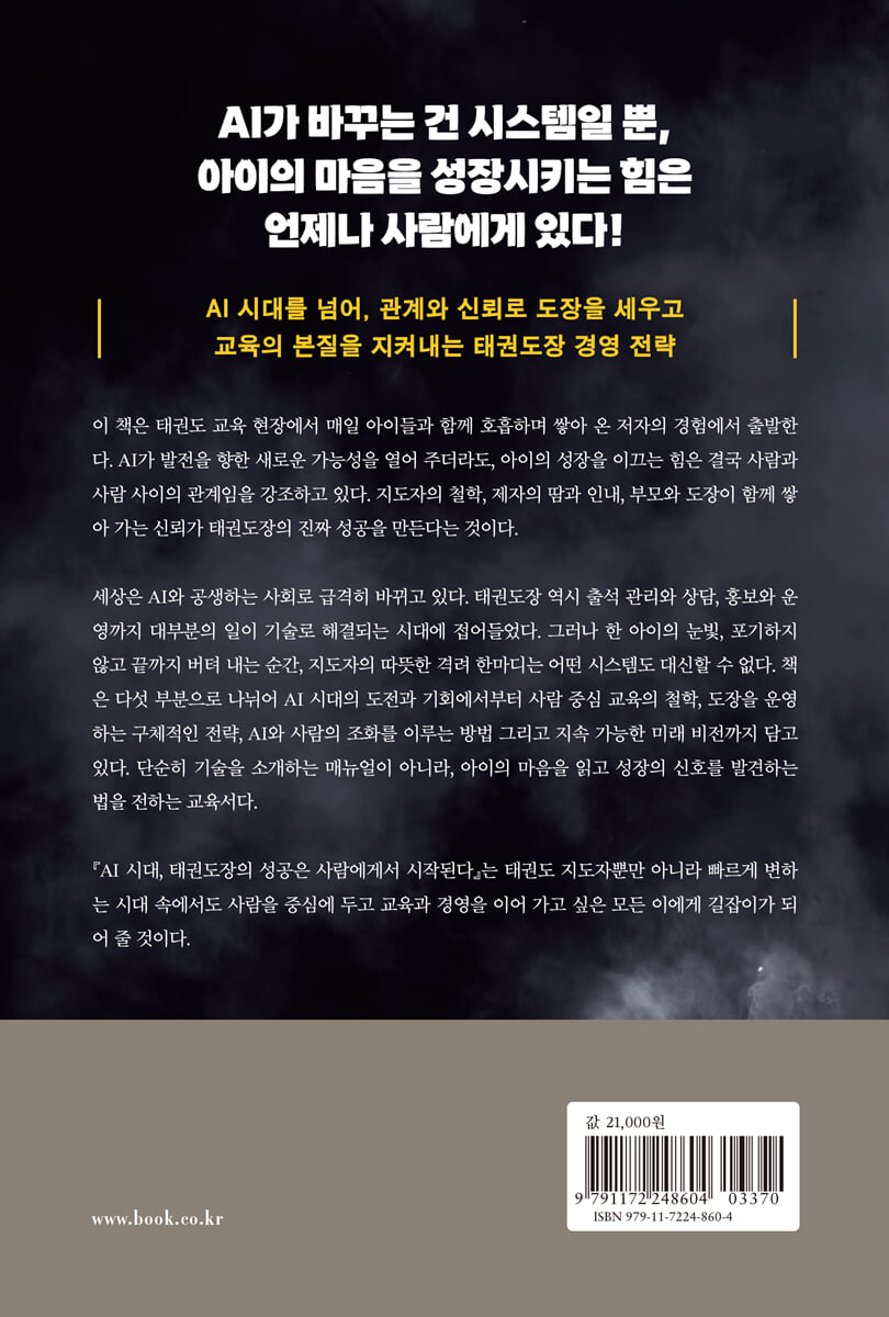 1부 AI 시대와 태권도장의 새로운 도전 1장 AI와 ChatGPT 그리고 태권도장의 현재 AI·ChatGPT가 불러온 변화 태권도 교육 현장의 디지털 전환 기술이 대체하지 못하는 교육 영역 2장 기술의 도움과 한계: 데이터가 줄 수 없는 것 수치로는 설명할 수 없는 성장 교육의 감성과 관계의 힘 AI가 놓치는 ‘마음의 신호’ 3장 전 세계 네트워크 시대, 태권도장의 기회와 위기 국경 없는 교육 경쟁 온라인·글로벌 네트워크 활용 전략 지역성을 잃지 않는 브랜딩 4장 AI 시대의 지도자 정체성 기술보다 앞선 리더의 철학 AI를 도구로 쓰는 법 변하지 않는 지도자의 존재 가치 2부 성공하는 태권도장의 사람 중심 철학 1장 태권도장의 철학과 비전 세우기 사명과 목표의 명확화 비전이 운영 방향을 결정한다 철학이 흔들릴 때의 위험 2장 태권도보다 중요한 인성 교육 기술보다 먼저 가르쳐야 할 것 인성 교육의 단계별 설계 AI 시대에도 필요한 인성 리더십 3장 초심과 수련생 중심 교육 첫 수업의 감동 만들기 아이가 주인공이 되는 수업 초심 유지 시스템 4장 지도자의 리더십과 신뢰 존경받는 지도자의 조건 신뢰를 쌓는 말과 행동 위기 속 리더십 5장 상담의 힘– 등록보다 중요한 관계 형성 상담은 ‘판매’가 아니라 ‘공감’ 부모 마음을 여는 질문 관계가 등록을 만든다 6장 부모, 수련생, 지도자가 함께 성장하는 삼위일체 교육 교육 주체 3자의 역할 신뢰 기반 공동 목표 세우기 함께 만드는 성장 스토리 3부 사람을 키우는 경영 전략 1장 퍼스널 브랜딩 - 관장의 색을 만들다 지도자의 색이 도장의 색이다 나만의 강점 찾기 2장 팀워크와 조직 문화 - 직원과 보조 사범 관리 건강한 조직 문화 설계 역할 분담과 책임 부여 갈등을 성장의 기회로 3장 오래 함께하는 사범 만들기 성장 경로와 비전 제공 인정과 보상의 힘 퇴사율을 낮추는 환경 만들기 4장 교육의 작은 성공 경험 설계 단계별 목표 설정 ‘성공 경험’의 심리학 지속적인 동기 부여 전략 5장 특별 프로그램과 캠프 운영 차별화된 콘텐츠 기획 시즌별·연령별 운영 팁 학부모 참여 프로그램 6장 승급 심사와 성장 스토리 만들기 심사 기준의 명확화 성장 피드백 제공법 방식 심사를 ‘축제’로 만드는 방법 4부 AI를 활용한 스마트 도장 운영 1장 AI 시대의 수업 관리와 데이터 활용 출석·성취 데이터 분석 데이터 기반 피드백 2장 ChatGPT를 활용한 홍보·마케팅 전략 블로그·SNS 콘텐츠 자동 생성 부모 눈에 띄는 마케팅 문구 만들기 지역 최적화 홍보 전략 3장 AI 기반 상담 자료 및 커뮤니케이션 자동화 상담 전 자료 자동 준비 반복 질문 자동 응답 상담 후 피드백 자동 발송 4장 기술과 사람의 조화로운 운영 모델 AI와 인간의 역할 구분 기술 과잉의 부작용 효율을 위한 기술의 역할 5장 운영비 절감을 위한 스마트 설비와 AI 활용 에너지 절약형 설비 도입 AI 기반 비용 분석 장기 운영비 절감 로드맵 5부 지속 가능한 태권도장 만들기 1장 장기적 입지 선정과 자가 건물 전략 입지 분석 방법 임대와 자가의 장단점 부동산 가치와 경영 안정성 2장 명품 브랜드처럼 브랜딩하는 태권도장 브랜드 철학 확립 프리미엄 이미지 구축법 ‘줄 서는 도장’ 만들기 3장 미래 교육과 글로벌 태권도 네트워크 해외 교류·연수 프로그램 글로벌 마케팅 채널 세계 속 태권도장의 역할 4장 AI 시대를 넘어, 사람으로 완성되는 경영 시대를 초월한 교육 가치 사람 중심 경영의 최종 목표 다음 세대를 위한 유산 에필로그 |