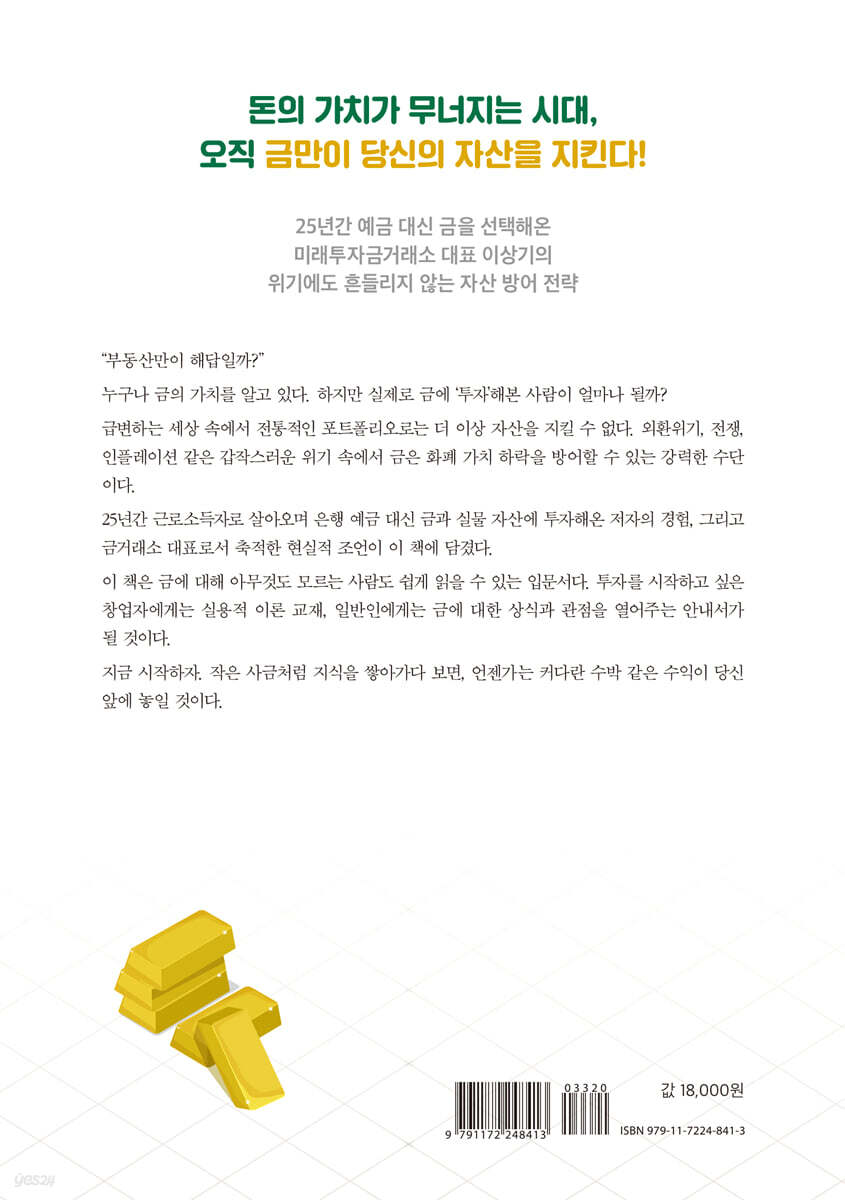 제1장 자산 준비 노후 파산 대비 안전자산 보유 불확실한 미래의 안전판 자본 소득 획득 제2장 돈과 화폐 돈과 화폐 화폐가 아닌 돈에 투자 통화의 타락 금이 화폐가 된 이유 통화 체계 연방준비제도(Federal Reserve System) 명목금리와 실질금리 금시장 금과 달러 시뇨리지(seigniorage) 금과 환율 금과 주식 금과 비트코인(BTC) 금화 불리온 금화(Bullion Coin) 제3장 금의 특성 금의 물리적 특성 금 생산 도시 광산 금 지상 재고 우리나라도 금 생산국 국가별 금 보유량 금 선호 국가 금 통제 위기의 금 금 생산 감소 제4장 금 매매 금 가격 계산 트로이온스(Troy Ounce) 금 순도 검인 마크 골드바 금값 상승 분석료 지역별 선호도 금과 은 가격 배율(GSR, Gold to Siver Ratio) 금 월별 수익률 금 투자 방식 제5장 금과 희귀금속 화이트 골드, 플래티넘 알로이(Alloy) 청화금(PGC, Potassium Gold Cyanide) 염화금(Gold Chloride) 외국 금 희귀금속 인공 금 가짜 금 일렉트럼, 노르딕 골드 제6장 부록 금 관련 창업 제품별 사이즈 허위 신분증, 사고 수표 마치며 참고 문헌 |