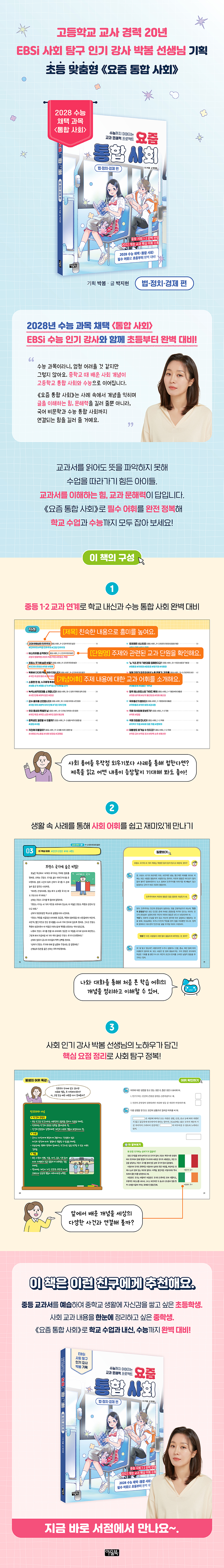 수능까지 이어지는 사회 개념어 완전 정복! 이제 사회는 암기가 아니라 이해다. 세상을 지적으로 바라보는 즐거움을 경험하라! 1. EBSi 사회 탐구 인기 강사가 직접 기획한, 검증된 학습 설계 《요즘 통합 사회》는 EBSi 수능 사회 탐구 인기 강사로도 유명한 박봄 선생님이 직접 기획했습니다. 박봄 선생님은 아이들이 중학 사회 개념어만 제대로 알아도 학교 수업과 내신, 수능까지 수월하게 공부할 수 있다고 강조했습니다. 그리고 오랜 현장 경험을 바탕으로 아이들이 실제로 어려워하는 사회 어휘들을 선별해 이 책에 담았습니다. 2. 지금 배우는 사회 개념어, 수능까지 그대로 간다 사회는 학년이 올라가도 범위만 넓어질 뿐, 기본 개념어는 그대로 이어집니다. 따라서 초등 고학년과 중학생 때 사회 핵심 개념어를 제대로 익혀 두는 것이 중요합니다. 《요즘 통합 사회》는 이 점에 주목해, 초등 고학년·중학생이 꼭 알아야 할 핵심 개념어를 명확한 설명한 설명과 함께 실었습니다. 《요즘 통합 사회》를 통해 다진 사회 개념어는 고등학교 통합 사회와 수능으로 자연스럽게 연결될 것 입니다. 3. ‘사례 → 대화 → 정리’로 이어지는 3단계 학습 이 책은 뉴스 기사, 인터뷰, 일기 등 아이들의 눈높이와 가까운 글에서 출발합니다. ‘주민 참여 예산제’, ‘기후 위기’, ‘국제 분쟁’ 같은 현실적 사례 속에서 학습 개념의 단서를 발견하게 됩니다. 이어지는 로봇 고양이 미미와의 대화 코너에서는 문답을 통해 개념을 이해하고, 마지막 요점 정리에서는 교과서 핵심 개념을 간결하게 짚어 줍니다. 이렇게 아이들은 사례 속에서 배우고 대화 속에서 이해하며, 정리를 통해 체계적으로 지식을 완성할 수 있습니다. 4. 사회 공부로 시작해 전 과목으로 확장되는 교과 문해력 독서량은 줄고, 숏폼 영상만 소비하는 아이들이 늘면서 학교 수업의 가장 큰 문제로 ‘문해력 저하’가 떠오르고 있습니다. 교과서를 읽고도 내용을 이해하지 못해 수업을 따라가지 못하는 아이들이 많아진 지금, 그 해답은 《요즘 통합 사회》에 있습니다. 이 책을 통해 교과 필수 어휘를 익히고, 다양한 글과 대화 등 글을 읽고 이해하는 연습을 하며 아이들은 스스로 교과서를 읽고 이해하는 힘, 교과 문해력을 키울 수 있습니다. 이렇게 성장한 교과 문해력은 전 과목으로 확장되어 학년이 올라가도 흔들리지 않는, 탄탄한 교과 이해력의 바탕이 됩니다. |