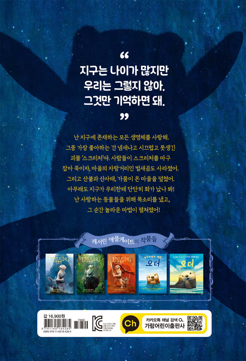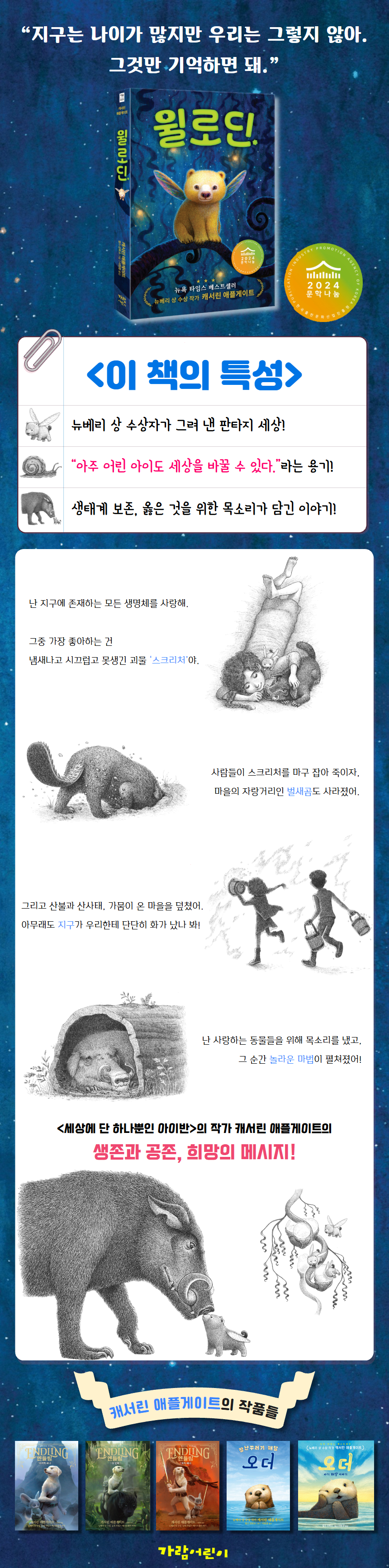 “살아 있는 모든 것은 저마다 존재하는 이유가 있고, 사랑받고 존중받을 가치가 있다.” 열한 살 소녀 윌로딘은 비극적인 화재로 가족을 모두 잃고, 두 명의 아주머니와 함께 살고 있다. 아주머니들이 자신을 얼마나 사랑하는지 알지만 윌로딘은 아주머니들에게도, 그리고 자신이 머무는 집에도 선뜻 마음을 열지 못한다. 학교에 다니는 것도 거부하며 친구도 사귀지 않는 윌로딘은 대신 자연을 관찰하고 조사하면서 학교에서 배우지 못하는 많은 것들을 알게 된다. 지구에 존재하는 모든 생명체를 사랑하는 윌로딘은 그중에서도 ‘스크리처’라고 불리는 혐오스러운 짐승에 푹 빠져 있다. 마을 사람들은 괴물이라고 부르며 마구 잡아들이지만, 윌로딘은 스크리처가 복잡한 자연 생태계에서 중요한 역할을 한다고 믿는다. 마을 사람들이 관심을 갖는 건 해마다 마을을 찾아오는 ‘벌새곰’이다. 나무에 빛나는 거품 둥지를 만들어 겨울을 나는 벌새곰은 마을의 자랑이자 관광객을 끌어들이는 주요 수입원이다. 그런데 벌새곰의 수가 점점 줄어들다가 올해는 한 마리도 보이지 않게 되고, 관광객을 맞을 준비를 하던 마을 사람들은 깊은 시름에 잠긴다. 윌로딘은 우연한 계기로 마을 소년 코너와 친구가 되고, 코너가 만들어 준 생일 선물로 마법을 경험한 뒤 벌새곰이 돌아오지 않는 이유를 조사하기 시작한다. 그 과정에서 벌새곰이 사라진 이유가 스크리처와 관계가 있다는 사실을 알게 된다. 『윌로딘』은 생존과 공존, 희망의 메시지가 담긴 모두가 즐길 수 있는 판타지다. 이 책의 주인공 윌로딘은 이제 막 열한 살이 된 소녀이다. 세상을 움직이는 건 어른들이라며 자신의 의견을 말하는 걸 주저하던 윌로딘은 자연의 세계에서 늘 약자처럼 보이는 스크리처들을 위해 용기를 내어 사람들 앞에 나선다. 스웨덴의 환경 운동가 그레타 툰베리의 “아주 어린 아이도 세상을 바꿀 수 있다.”는 말처럼, 비록 작고 어리고 어색하더라도 어린아이의 용기 있는 목소리가 변화를 만들어 낼 수 있다는 메시지를 전하고 있다. 애플게이트는 어린 주인공들이 용기를 내고 동시에 어른들의 존중을 얻어 냄으로써 큰 힘을 발휘하는 모습을 잘 보여 준다. 『세상에 단 하나뿐인 아이반』으로 아동 문학의 노벨상이라 불리는 뉴베리 상을 수상한 캐서린 애플게이트는 이 책을 통해 우리가 살고 있는 생태계가 거미줄처럼 촘촘히 얽혀 있다는 사실과, 자연의 모든 구성원이 아무도 이해하지 못하는 방식으로 연관되어 있다는 사실을 전하고 있다. 아름답고 복잡하게 뒤얽힌 이 세상에서 살아 있는 모든 것은 저마다 존재하는 이유가 있고 사랑받고 존중받을 가치가 있다는 것을 알려 주는 사랑스러운 동화이다. 윌로딘이 사는 세상은 마법이 살아 있는 세상이지만 우리가 사는 세상과 그리 다르지 않고, 아이들이 직면하는 문제들도 크게 다르지 않다. 마법과 매우 현실적인 환경 메시지가 어우러져 있는 이 책에서는 인간이 초래한 해악에 대해 경고하고, 자연의 회복력과 상호 연관성을 강조한다. 판타지에 강하게 뿌리를 두고 있지만, 동시에 생태계 보존이라는 현실 세계의 문제를 다루고 있다. 또한 사랑과 우정, 아끼는 것을 잃는 상실감, 옳은 것을 위해 목소리를 낼 수 있는 용기와 사회 구성원으로서의 성장을 다루고 있다. 윌로딘이 스스로를 가둔 고립에서 서서히 벗어나 자신의 목소리를 낼 줄 아는 인간으로 성장하는 모습은 독자들에게 깊은 여운을 안겨 줄 것이다. |
