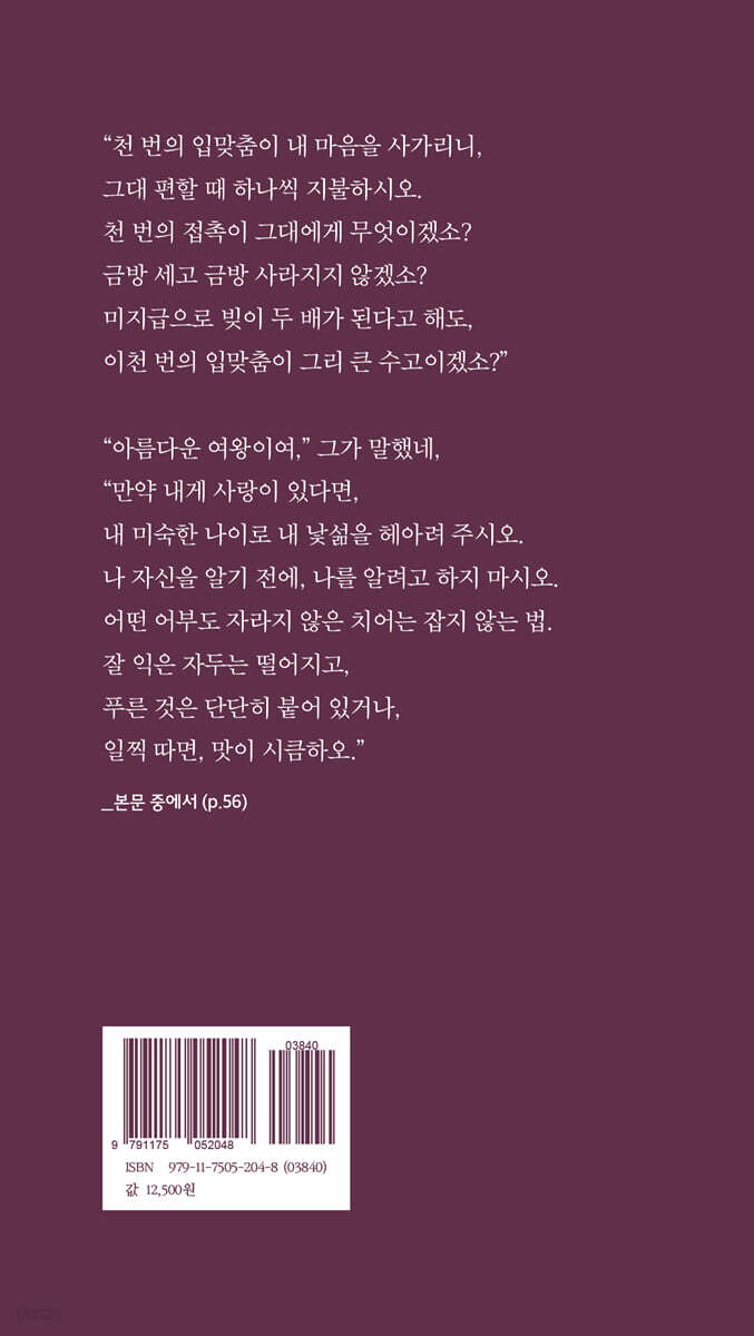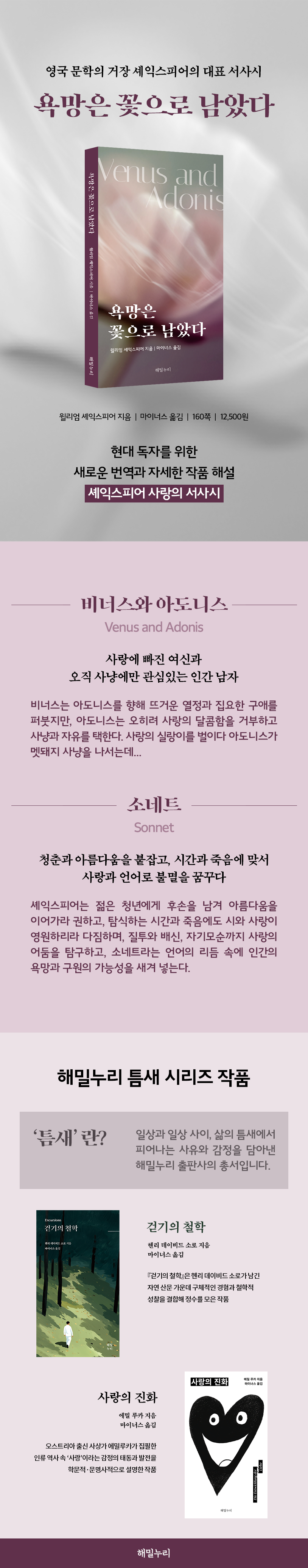 ★ 사랑의 쾌락, 질투와 배신, 그리고 시간과 죽음을 넘어선 언어의 기적 ★ ★ 관능과 순수, 젠더와 권력의 전복을 담아낸 르네상스 문학의 정수 ★ 《욕망은 꽃으로 남았다》는 셰익스피어의 대표 서사시 『비너스와 아도니스』와 전반부 소네트들을 한 권에 담아, 르네상스 문학의 매혹적 심장을 오늘의 한국어로 되살린 작품이다. 이 책은 단순한 신화의 재현이나 고전의 모음이 아니라, 인간 존재·사랑·시간·죽음을 탐구한 셰익스피어 문학 세계의 총체적 초대장이다. 『비너스와 아도니스』에서 사랑의 여신 비너스는 완벽한 미남 아도니스를 향해 집요한 구애를 던지지만, 그는 이를 거부하고 자유와 사냥을 선택하다가 비극적 죽음을 맞는다. 비너스의 불타는 입맞춤, 아도니스의 붉은 피, 그 피에서 피어나는 아네모네 꽃은 욕망의 덧없음과 예술 속 사랑의 불멸성을 강렬한 상징으로 보여준다. 이 장면은 젠더와 권력 관계를 전복하며, 사랑과 욕망이 단순한 감정이 아니라 선택·자유·운명의 문제임을 드러낸다. 함께 수록된 소네트들은 ‘셰익스피어식 소네트(Shakespearean Sonnet)’의 전통적 형식을 지키면서도, 청년의 아름다움과 시간의 무자비함, 사랑의 구원과 배신, 그리고 언어의 불멸을 노래한다. 소네트 XIX, XXX, XXXV, XLV 등에서는 탐식하는 시간과 죽음의 냉혹함이, XVIII과 XIII에서는 시와 후손을 통한 불멸의 약속이, XL-XLII에서는 사랑과 질투, 배신의 아이러니가 드러난다. 셰익스피어는 태양, 구름, 불사조, 메리골드 같은 자연 이미지를 통해 운명과 감정의 변화를 비유하고, 마지막 두 행의 쌍행(couplet)으로 희망이나 반전을 제시하며 독자를 사로잡는다. 이번 번역은 오행보격의 리듬과 은유의 깊이를 살려, 원문의 운율과 숨결을 가능한 한 현대 한국어 속에 온전히 옮기고자 했다. 이 책은 고전의 아름다움을 단순히 복원하는 데서 그치지 않고, 사랑의 환희와 상실, 욕망의 힘과 허무, 청춘의 찰나적 아름다움이 오늘의 독자에게도 여전히 살아 있음을 증명한다. 《욕망은 꽃으로 남았다》는 셰익스피어의 사랑과 욕망의 미학, 시간과 불멸의 역설, 그리고 인간 감정의 심연을 이해하기 위해 반드시 읽어야 할, 총망라된 서사시이자 시편집이다. 이 책은 르네상스의 숨결을 품은 언어의 향연으로, 시대와 문화를 넘어 깊은 울림을 전할 것이다. |