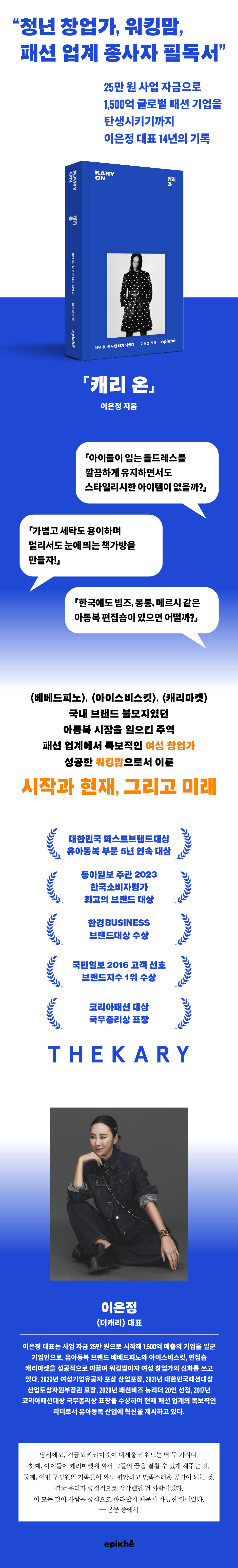 베베드피노의 시작은 블로그로부터 스카프 빕과 블루머도 우리 스타일로 베베드피노가 걸어온 성장의 여정 베베드피노는 곧 우리의 이름 브랜드의 성장과 함께하는 고민들 우리의 다음은 아이스비스킷 꿈의 공간, 캐리마켓을 열다 팬데믹은 우리에게 오히려 기회 우리만의 시그니처를 만들기까지 내가 사랑한 더캐리의 제품들 뭔가 특별한 더캐리의 직원들 누군가를 온전히 진심으로 대하려면 서울 토박이, 대구로 전학가다 늘 사람들에게 베풀라는 한마디 청춘과 방황의 날들 너만큼 패션을 잘 아는 사람은 없어 더없이 고마운 나의 전 직장들 엄마와 함께한 마지막 일 년 행신동에서 시작된 새로운 챕터 워킹맘으로 나답게 사는 법 진정한 나를 완성하는 취향에 대하여 자주 받는 질문들 Epilogue 언제나 함께여서 든든합니다 |