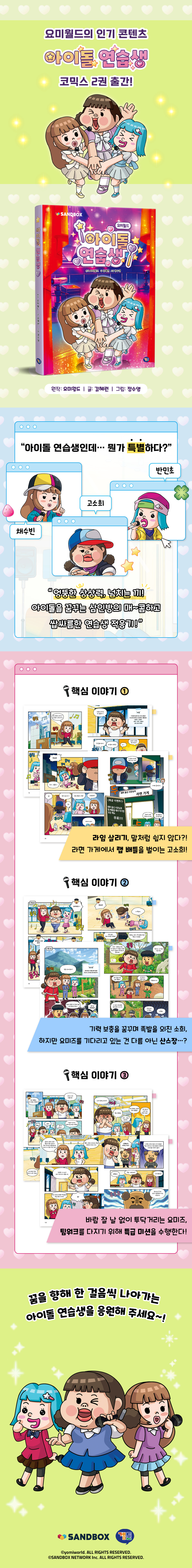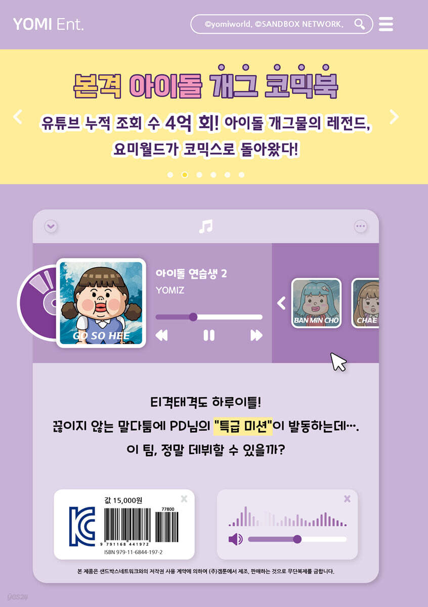 무대 위의 빛을 향해 한 걸음 더! 돌아온 요미즈, 이번엔 더 강력하고 더 유쾌하다! 혹독한 연습생 생활을 겪으며 진짜 아이돌의 꿈을 향해 달려가는 그들의 이야기가 펼쳐집니다. 성격은 여전히 제멋대로지만, 한층 단단한 팀워크를 다져 가는 요미즈! 웃음은 더 커지고 사건은 더 시끌벅적해진 2막의 시작! 과연 요미즈는 완성형 그룹으로 나아갈 수 있을까? 지금 바로, 새로운 무대에 오른 그들을 만나 보세요! 차세대 K-POP을 노리는 요미즈, 파란을 일으킬 준비 완료! 그들의 개성과 열정이 담긴 프로필을 소개합니다. *전설의 연습생 고소희 생일: 08.10 키: 160cm 취미: 마라탕에 당면 추가하기 자기소개: 랩을 잘하려면 라임을 살려야 한다규~! 요즘 나는 마라탕을 먹으면서 목소리를 부드럽게 만드는 중이야. 랩 잘하는 방법 궁금하지? 박자를 쪼개! 쪼개! 앗~, 마라탕 배달 왔다! 그럼 이만~. *뉴 페이스 연습생 채수빈 생일: 03.05 키: 163cm 취미: 복식 호흡 연습하기 자기소개: 후! 하! 후! 하! 요즘 산스장에 다니며 폐활량을 늘리려고 노력해요! 요미즈 멤버들과 다 함께 데뷔해서, 언젠가는 무대에 나란히 서고 싶답니다! *귀염뽀짝 연습생 반민초 생일: 11.11 키: 167cm 취미: 민초 음식 반대하기 자기소개: 나는 반민초, 민초 향이 들어간 음식은 찌약 맛이 나서 싫따구! 가끔 고쪼희 쩐배가 민초아이쯔크림을 사 오면, 연습실에 민초 향이 쫘악 퍼찐단 말야! 고쪼희 쩐배, 다시는 민초 먹찌 마~! |