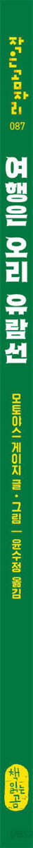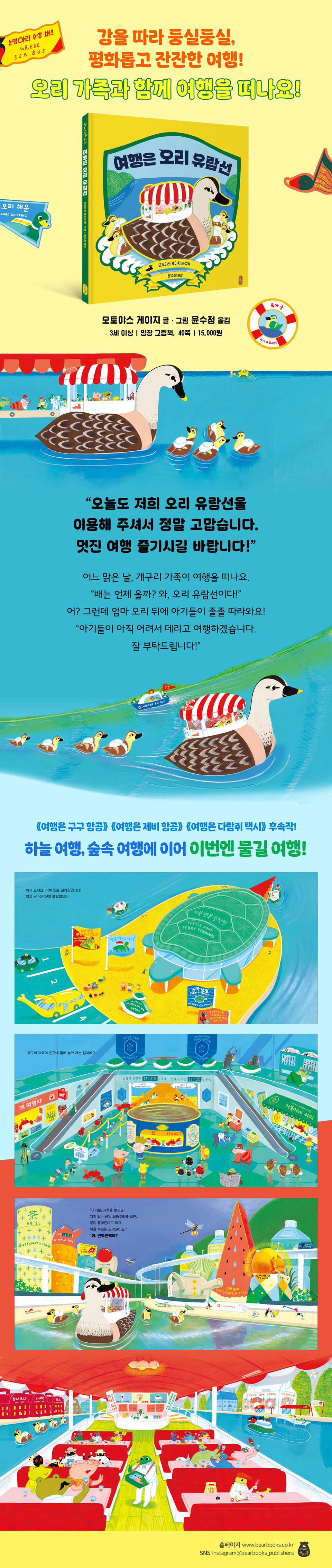 어느 맑은 날, 개구리네 가족이 ‘거북 연못 선착장’에 도착했습니다. 배를 타고 둥실둥실, 강 건너 친구네 집에 놀러 가는 길입니다. 신이 난 꼬마 개구리가 창밖을 내다보다가 소리를 지릅니다. “오리 유람선이야!” 오리 가족이 부드럽게 물결을 가르며 선착장으로 들어옵니다. 엄마 오리 등에는 유람선이 실려 있습니다. “지금부터 배에 올라타 주시기 바랍니다. 아기들이 아직 어려서 데리고 여행하겠습니다. 잘 부탁드립니다!” 작은 손님들을 등에 태운 엄마 오리가 강을 따라 천천히 내려갑니다. 아기 오리들도 엄마 뒤를 졸졸 따라갑니다. “오늘 저희 유람선을 이용해 주셔서 정말 고맙습니다. 모쪼록 멋진 여행을 즐기시기 바랍니다.” 《여행은 오리 유람선》은 모토야스 게이지의 〈여행은〉 시리즈 네 번째 책입니다. 전작들에서 하늘 높이 날아올라 먼먼 곳으로, 택시를 쌩쌩 몰고 숲속으로 떠났던 데 이어, 이번엔 다정한 오리 가족과 함께 물길로 여행을 떠납니다. 전편들이 스케일과 속도감으로 가슴 뛰는 즐거움을 안겨 주었다면, 이번 편은 잔잔한 물결에 몸을 맡긴 듯한 고즈넉함과 평화로움을 선사합니다. 책장을 넘길 때마다 따사로운 햇살과 상쾌한 공기, 은은한 꽃향기며 풀 냄새가 생생하게 느껴지는 듯합니다. 이번 이야기에는 가족 사이의 사랑이 은은히 표현되어 있습니다. 여행객들을 실어 나르는 동안에도 아기들을 살피며 그윽한 눈길을 보내는 엄마 오리, 엄마를 졸졸 따르며 앙증맞게 흉내 내는 아기 오리들의 모습이 저절로 미소를 짓게 만듭니다. 여정을 모두 마친 뒤 오리 가족은 들꽃이 만발한 풀밭에 자리를 펴고 옹기종기 모여 앉아 간식을 나눠 먹습니다. 어느새 무더위가 한풀 꺾이고 공기가 한결 상쾌해진 요즘, 온 가족이 풀밭에서 이마를 맞대고 함께 읽어 보기에 그만인 책입니다. “오늘도 오리 유람선을 이용해 주셔서 고맙습니다. 멋진 여행 즐기시기 바랍니다!” 이 책은 개구리네 가족이 ‘거북 연못 선착장’에서 배에 오른 뒤 ‘연꽃 피는 연못 선착장’에 내려 친구와 만날 때까지의 여정을 유려하게 보여 줍니다. 책을 펼치면, 맨 먼저 거북 연못 선착장의 전경이 등장합니다. 거북 모양을 본뜬 웅장한 선착장 앞에 이제 막 도착한 개구리 가족이 보입니다. 자그마한 뒷모습이지만, 꼬마 개구리의 모습에서 여행에 대한 기대와 흥분이 느껴집니다. 선착장 안은 아주 널찍하고 깔끔합니다. 매표소, 여행사, 커피숍, 에스컬레이터 같은 편의 시설은 물론, 기념 스탬프를 찍는 테이블이며 음료 자판기까지 없는 게 없습니다. 선착장을 가득 채운 동물 손님들은 모두 다 기대에 찬 얼굴입니다. 드디어 오리 유람선이 도착하고, 본격적인 여행이 시작됩니다. 일하랴 육아하랴 바쁜 엄마 오리 뒤를 아기 오리들이 귀여우면서도 의젓한 모습으로 졸졸 따라갑니다. 유람선이 ‘차 마을’, ‘상자 도시’, ‘꽃밭’을 차례차례 지날 때마다, 눈부신 풍경과 멋진 구경거리가 눈길을 사로잡습니다. 배 위에서 사 먹는 도시락은 여행의 또 다른 즐거움입니다. 그때 갑자기, 투둑투둑 빗방울이 떨어집니다. 빗방울은 어느새 장대비로 바뀝니다. 하지만 문제없습니다. 다리 밑에서 잠깐 비를 그으면 되니까요. 때마침 ‘반 교향악단’ 배가 도착하고, 아기 오리들이 ‘귀뚜라미 관현악단’의 연주에 맞추어 노래를 시작합니다. 꼬마 개구리도 사이좋게 노래합니다. “꿱 꿱 꿱! 개굴 개굴 개굴!” “승객 여러분, 귀염둥이 연주자들에게 큰 박수를!” “브라보!” 빗속에서 신나게 노래하다 보니 어느새 해님이 고개를 내밉니다. 무지개가 하늘에 걸려 있습니다. 배는 다시 강을 따라 내려가고, 어느새 목적지에 도착합니다. 도롱뇽 가족이 개구리네 가족을 반갑게 맞이합니다. 오늘은 따뜻한 저녁이 두 가족을 기다리고 있을 것입니다. 볼수록 흥미롭고 아름다운 ‘작은 세계’ 구석구석 숨은 이야기를 찾아보는 즐거움! 작가 모토야스 게이지는 전편들에서 그랬듯이 이번에도 아기자기하고 재미있는 장치들을 보물찾기처럼 숨겨 놓았습니다. 〈여행은〉 시리즈를 꾸준히 읽어 온 독자들이라면, 오리 유람선이 강을 따라 내려가는 동안, ‘제비 항공’, ‘비둘기 항공’, ‘잠자리 택배’가 하늘을 나는 모습을 발견하고 반가워할 것입니다. 매번 감초처럼 등장하는 여행 작가 ‘김바나나 씨’도 반가운 얼굴입니다. 책장을 넘기다 보면, 이제 막 선착장에 도착한 김바나나 씨, 선착장 한쪽에서 기념 스탬프를 찍는 김바나나 씨, 커피를 마시며 취재 수첩에 뭔가를 부지런히 쓰고 있는 김바나나 씨, 아기 오리들이 빗속에서 합창하는 모습을 카메라에 담는 김바나나 씨를 만나게 됩니다. 강을 따라 늘어선 건물이며 구조물 등을 뜯어보는 재미도 쏠쏠합니다. ‘거미줄 공항’까지 직통으로 연결해 주는 ‘도롱이 벌레 모노레일’, 보기만 해도 복을 가져다준다는 황금빛 ‘쇠똥구리 탑’, 화려한 꽃이 흐드러진 ‘베고니아 다리’, 〈게러비안의 해적〉처럼 어딘가 익숙한 영화를 상영 중인 ‘꽃밭 극장’ 등 재치 있는 요소들이 가득합니다. 강에는 오리 가족 말고도 저마다 맡은 일을 열심