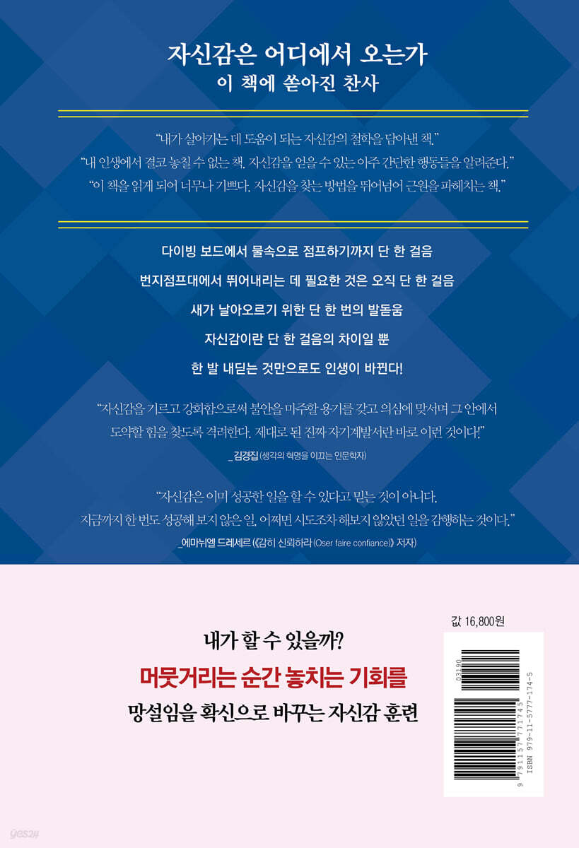 추천사_김경집(인문학자) 프롤로그_자신감은 어디에서 오는가 제1법칙 자신감은 어떻게 만들어지는가 _자신감을 끌어내는 결정적인 한마디가 있다 1. 자신감을 끌어내는 단 한마디 2. ‘너는 할 수 있다’가 ‘나는 할 수 있다’로 바뀌는 기적의 순간 3. 나를 찾는 것에서 자신감이 시작된다 4. 낯선 곳을 향해 첫걸음을 떼는 것 제2법칙 실력이 곧 자신감이다 _두려움이 사라질 만큼 탄탄한 실력을 쌓아라 1. 실력이 자신감으로 이어지는 순간 2. 작은 성공들이 자신감으로 쌓인다 3. 작은 변화가 큰 차이를 만든다 제3법칙 내 마음의 소리를 따른다 _자기 확신과 자기 신뢰가 자신감을 불러일으킨다 1. 자신감은 시간에 쫓기지 않는 것 2. 자신감은 방향을 잃지 않는 것 제4법칙 자신감은 결단력에서 비롯된다 _망설임 없이 선택하고 결정하는 법 1. 모든 결정은 불확실하다 2. 도전하기 전에 결정할 것 3. 사소한 것부터 결정하는 훈련 제5법칙 작은 성공이 자신감을 더욱 키운다 _매일 1가지씩 성공의 경험을 하는 법 1. 매일매일 성공을 맛보는 법 2. 호모 파베르의 자신감 수업 제6법칙 자신감은 일단 시작하는 것이다 _예측 불가능한 것들까지 즐기는 법 1. 한 걸음 내딛는 순간 2. 행동하면서 생각하라 제7법칙 누군가처럼 되고 싶을 때 자신감이 생긴다 _나의 욕망을 깨워줄 사람을 찾아라 1. 멈추지 않고 나아가는 힘 2. 나답게 사는 법 3. 나만의 길을 찾아내는 법 제8법칙 남과 비교하지 마라 _오직 나의 욕망에 충실하며 살아가는 법 1. 그 무엇과도 비교할 수 없는 ‘나’ 2. 욕망은 나의 것 제9법칙 자신감은 가능성을 믿는 것이다 _모든 좋은 것들이 앞날에 펼쳐져 있다고 믿는 법 1. 안전지대 밖으로 한 걸음 내딛는 것 2. 두려움을 길들이는 법 에필로그 |