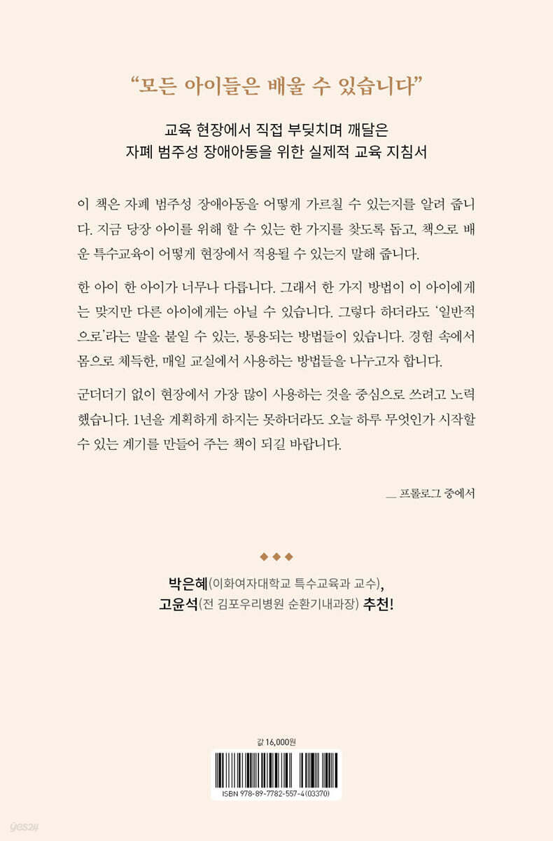이 책에는 이나영 선생님의 삶과 사랑이 듬뿍 담겨 있습니다. 자폐 범주성 장애아동을 돌본다는 것 자체가 긍휼함의 은사가 있지 않으면 불가능한 일이기 때문입니다. 이 책 안의 여러 가지 실제 사례들은 아이들을 사랑으로 돌보지 않으면 절대로 알 수도 쓸 수도 없는 내용들입니다. 그리고 이론만으로 해결되지 않는 많은 경우들을 저자의 수많은 경험과 사랑으로 극복한 사례들입니다. 이 책은 부모님들과 선생님들, 교회 선생님들에게 반드시 필요한 책일 뿐 아니라, 일반 독자들에게도 큰 도움이 될 것입니다. 장애인들을 사랑하는 모든 이들에게 이 책을 진심으로 추천합니다. - 고윤석 (전 김포우리병원 순환기내과장)