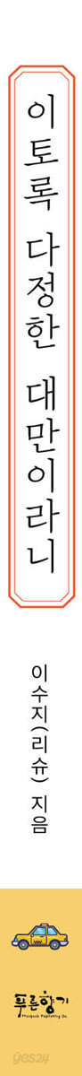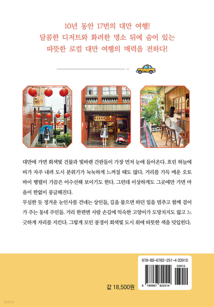 1부 고온다습의 나라에 오신 것을 환영합니다 자정에 도착한 타오위안 공항 - 타오위안, 타오위안 국제공항 불완전함이 만드는 완벽함 말할 수 없는 여행 - 신베이, 단수이, 위런마터우 나의 대만, 엄마의 대만 - 타이베이 타이난은 버스가 오지 않아요 - 타이난, 32레코드점 인생 첫 전동 오토바이 - 타이동, 뤼다오 생일맞이 가오슝 여행 - 가오슝 버블티와 펑리수 - 타이베이 2부 대만에서 마주한 다정함 같이 스노클링하러 갈래? - 핑둥, 컨딩 친절한 타이완런 샹산에서 보낸 따뜻한 연말 - 타이베이, 샹산 예상 밖의 동행 - 핑둥, 샤오리우치우 타이난의 조용한 카페에서 - 타이난, Tian Zaixin Cafe 기차역 앞 낡은 게스트하우스에서 - 타이난, 올드 맨 캡틴 호스텔 새우낚시터에서 생긴 일 벚꽃을 찾아서 - 타이중 난터우를 닮은 사람들 - 난터우 진먼에서 만난 인연 - 진먼 자이시에서 온 초대장 - 자이 할아버지의 작은 카페 - 가오슝, 허야카페 3부 느긋함 속에 머무는 여유의 미학 무계획이 계획 대만인들이 가장 살고 싶어 하는 도시 - 타이중 세계 10대 아름다운 자전거 도로, 르웨탄 - 난터우, 르웨탄, 자오우마터우 지우펀에서의 하룻밤 - 신베이, 지우펀 페달을 밟으면 보이는 것들 타이난에서 하루를 보낸다면 - 타이난, 치메이 박물관 여행 중에도 여행이 필요한 이유 대만 소도시의 매력 - 이란 새로운 시선과 이야기가 쌓이는 곳 - 타이베이, 디화제 마음을 채우는 느긋함 4부 가깝고도 먼 섬나라 동성혼이 가능한 나라에서 - 타이베이 지진으로 멈춰버린 1999년 - 타이중, 921 지진교육원구 노래방에 진심인 사람들 비 오는 날의 아리산 - 자이, 아리산 국가 삼림 공원 운수 좋은 날 - 화롄 허환산의 새벽 - 난터우, 허환산 호스텔에서 만난 중년 여성 여행자 - 타이베이 대만이라서 가능한 일 - 이란, 쑤아오 5년 만에 마주한 월세계 - 가오슝, 월세계지경공원 5부 혀끝으로 남긴 여행 특이하고 과감한 대만 피자 사당 앞에서 즐기는 바비큐 대만 과일에 관한 단상 밥심으로 완성된 타이동 - 타이동 뤼다오니까 가능한 조합 - 타이동, 뤼다오 고짜오웨이의 도시 - 타이난 한 잔에서 시작된 취향 음식으로 즐기는 고량주 - 진먼 EPILOGUE - 대만민국인은 될 수 없지만 |