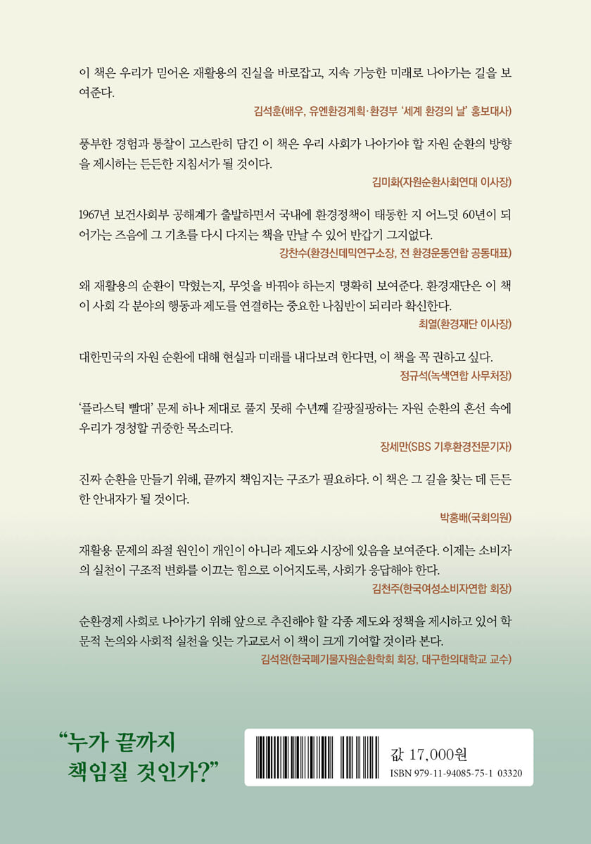 대한민국의 자원 순환에 대해 현실과 미래를 내다보려 한다면, 이 책을 꼭 권하고 싶다. - 정규석 (녹색연합 사무처장)