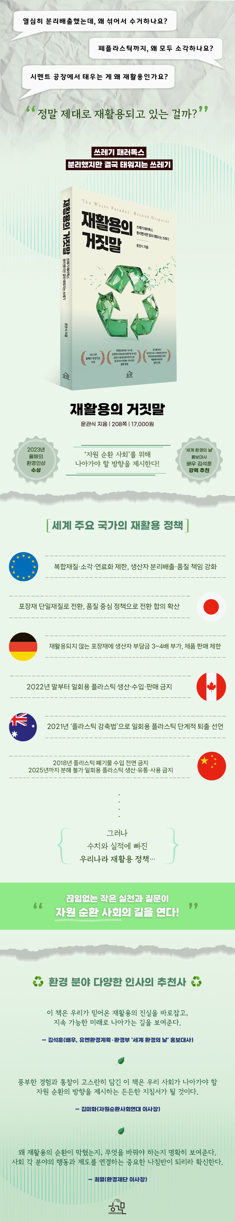 이 책은 우리가 믿어온 재활용의 진실을 바로잡고, 지속 가능한 미래로 나아가는 길을 보여준다. - 김석훈 (배우, 유엔환경계획·환경부 ‘세계 환경의 날’ 홍보대사)